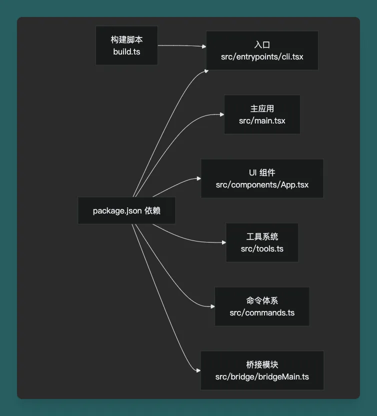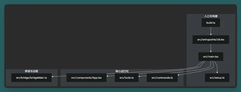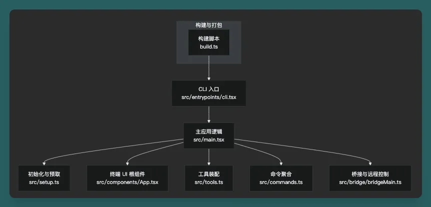 项目采用模块化与分层设计,围绕 CLI 入口、主应用逻辑、终端 UI 组件、工具系统、命令体系、桥接与远程控制等核心模块组织。