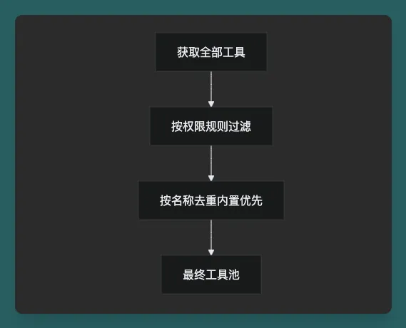 工具系统与权限过滤:统一收集内置工具与 MCP 工具,按名称去重;根据权限上下文剔除不允许使用的工具,并提供简化模式。