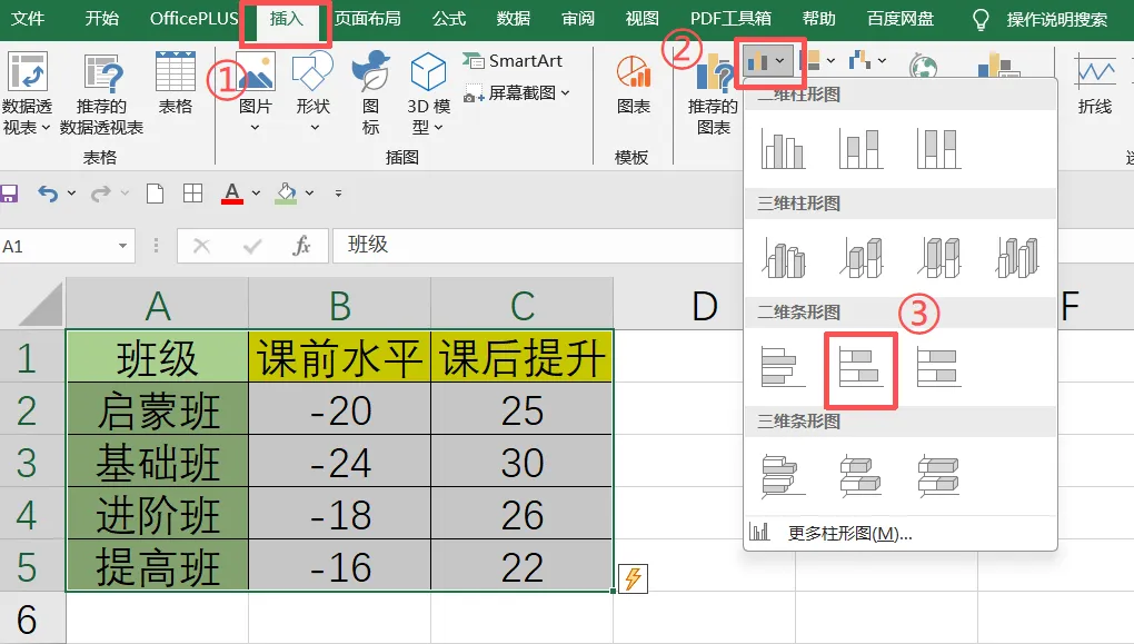 下面以比较不同班级在课前课后的得分情况为例,演示用Excel绘制堆积条形图的方法: