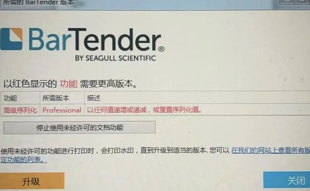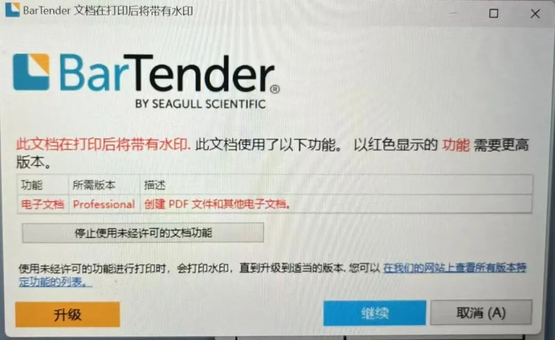文件使用了高版本功能,而当前使用的低版本软件无法支持,打印时会自动添加水印。(如下图提示)