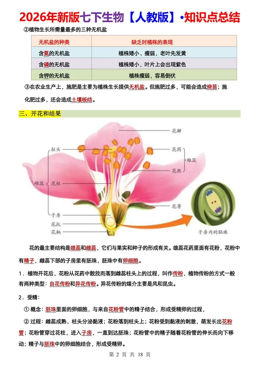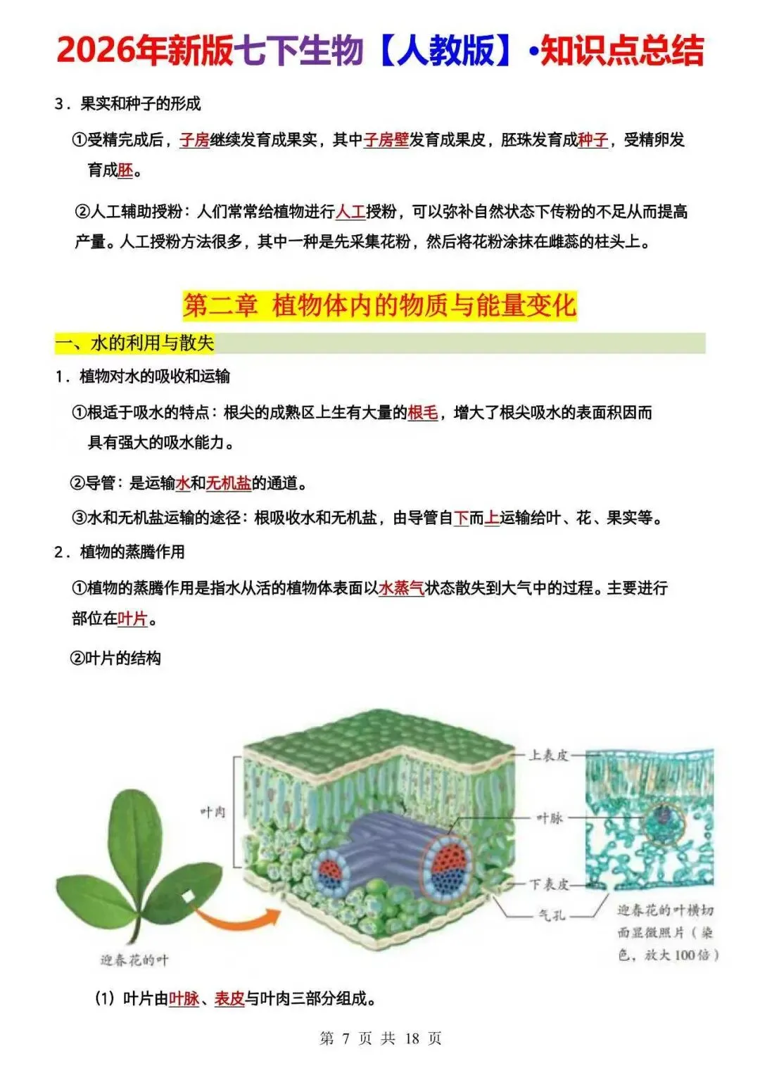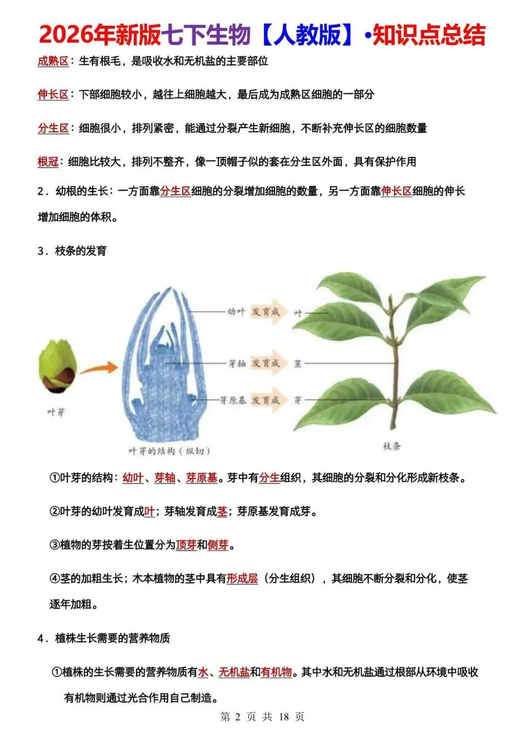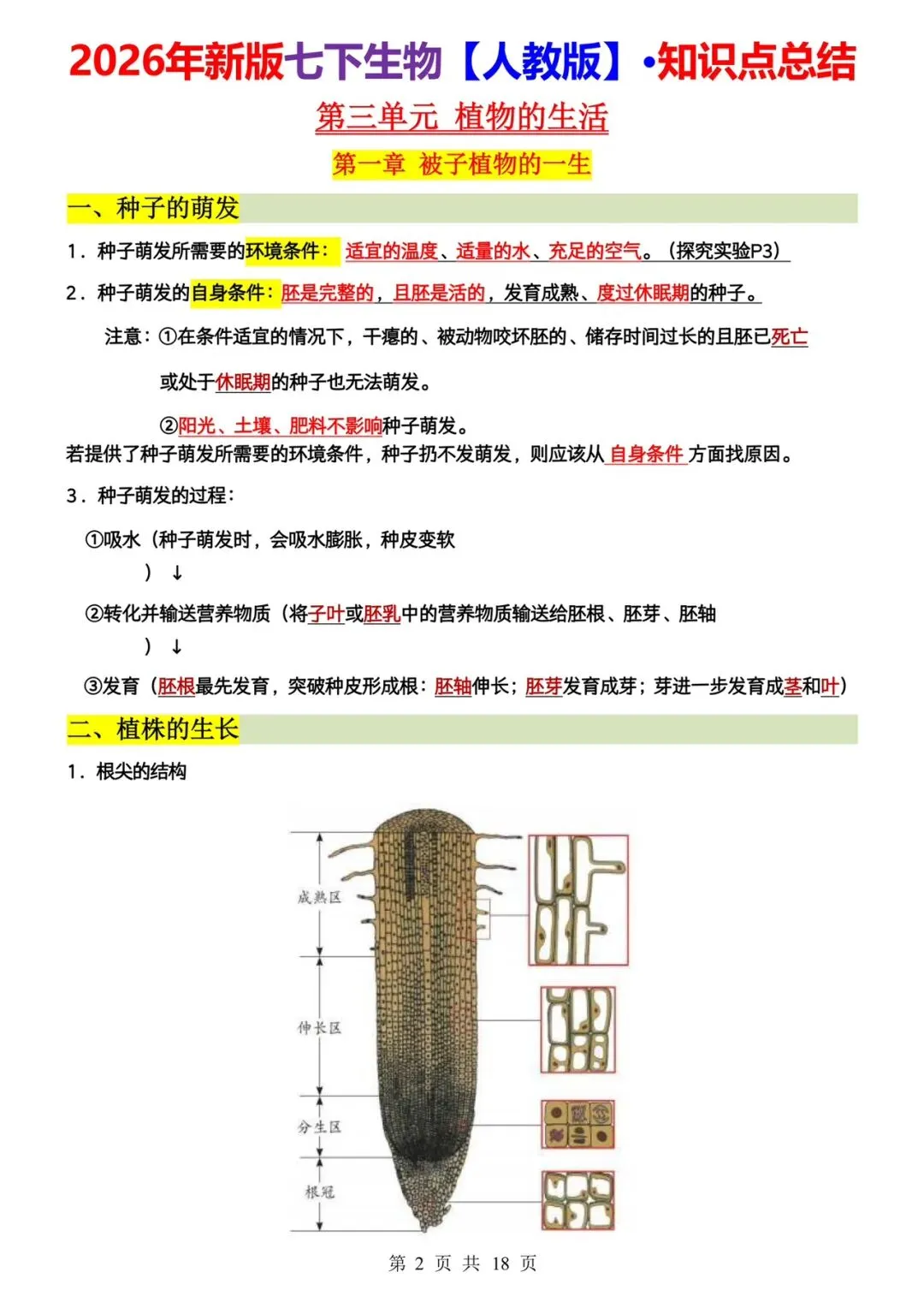 大家好,今天老师整理了:2026版七年级下册生物知识点清单,可打印电子版!