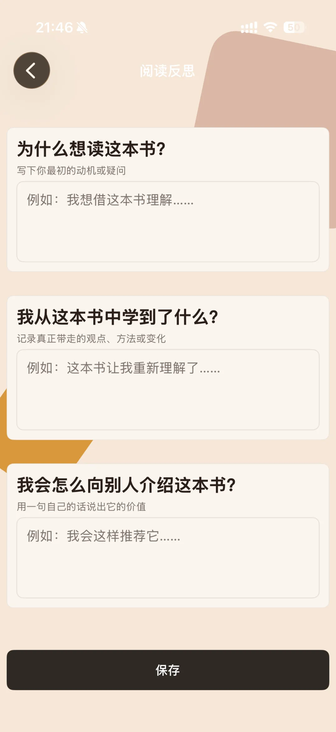 所以在 BooksArchive 里,除了碎片化的笔记摘录,我专门设计了一个“阅读反思”模块。它鼓励你在读完一本书后,试着回答三个问题: