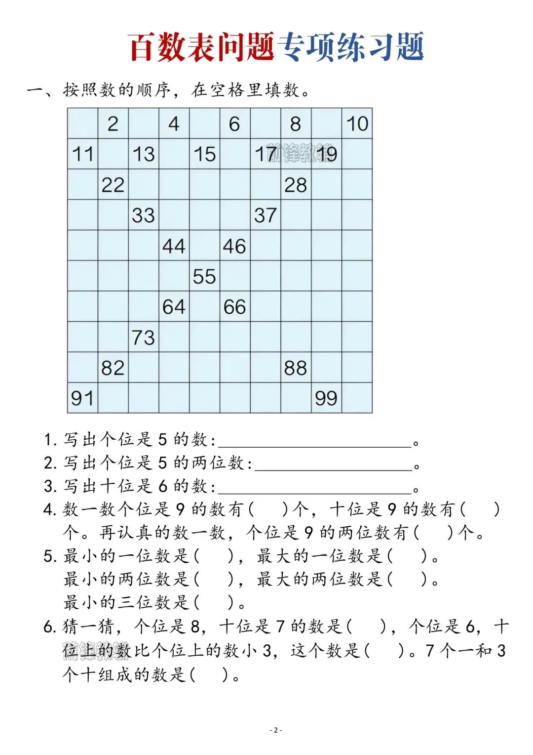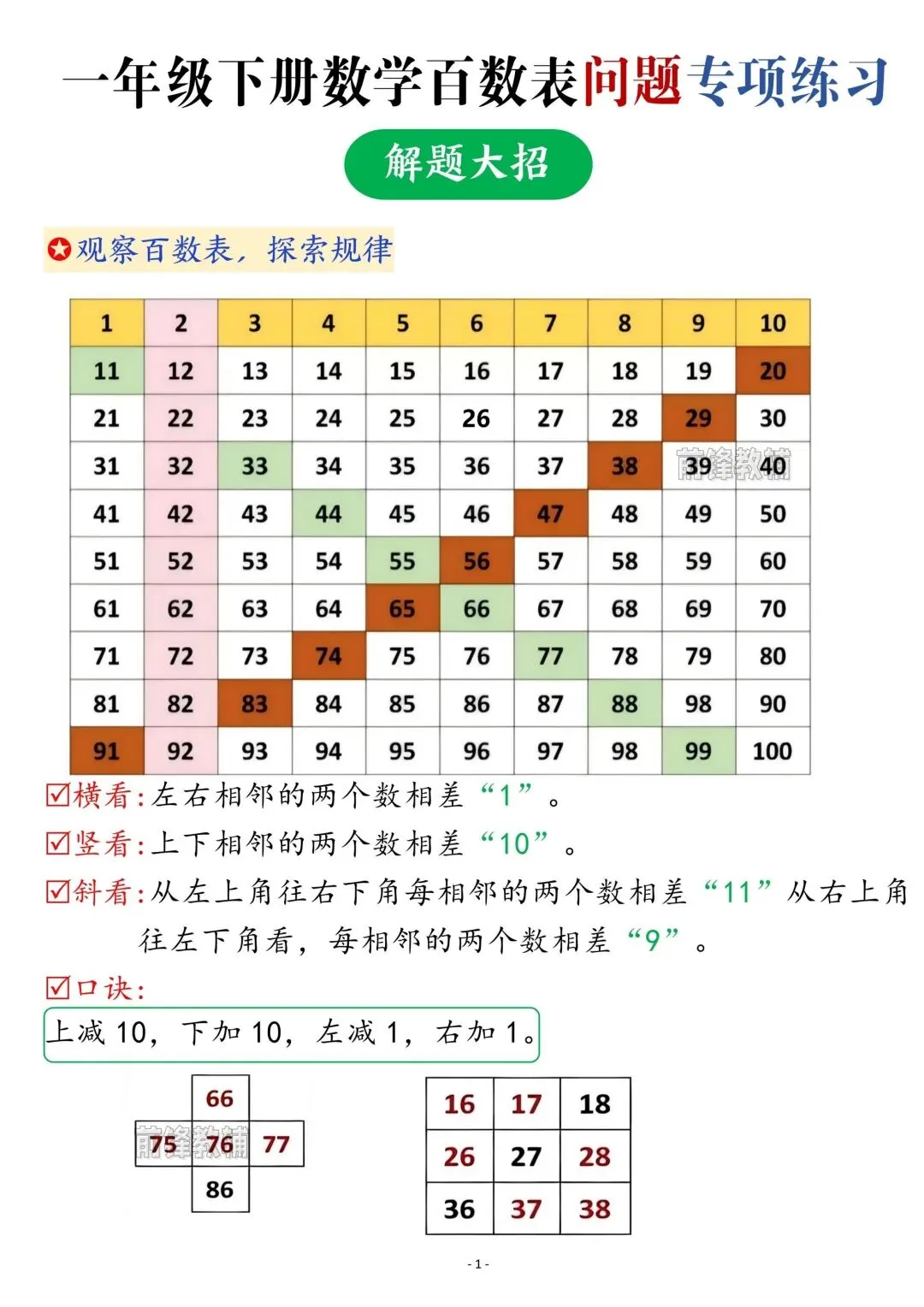 一下数学同步百数表问题口诀及练习可打印