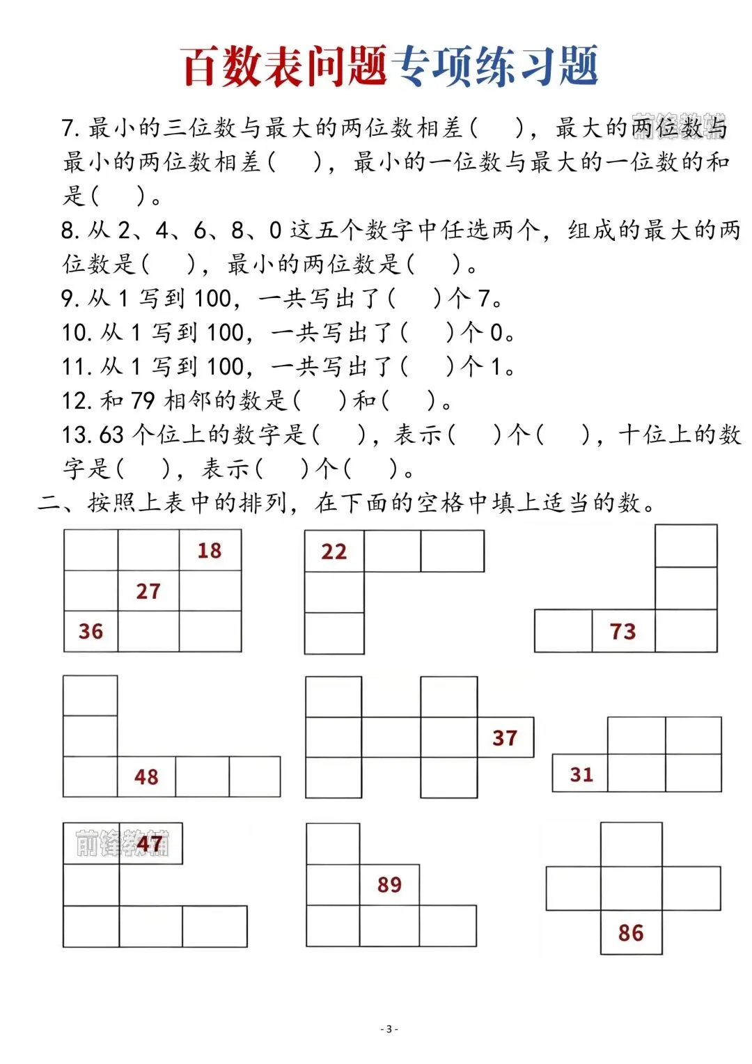 26一年纪下数学百数表问题专项练习包含口诀及练习。