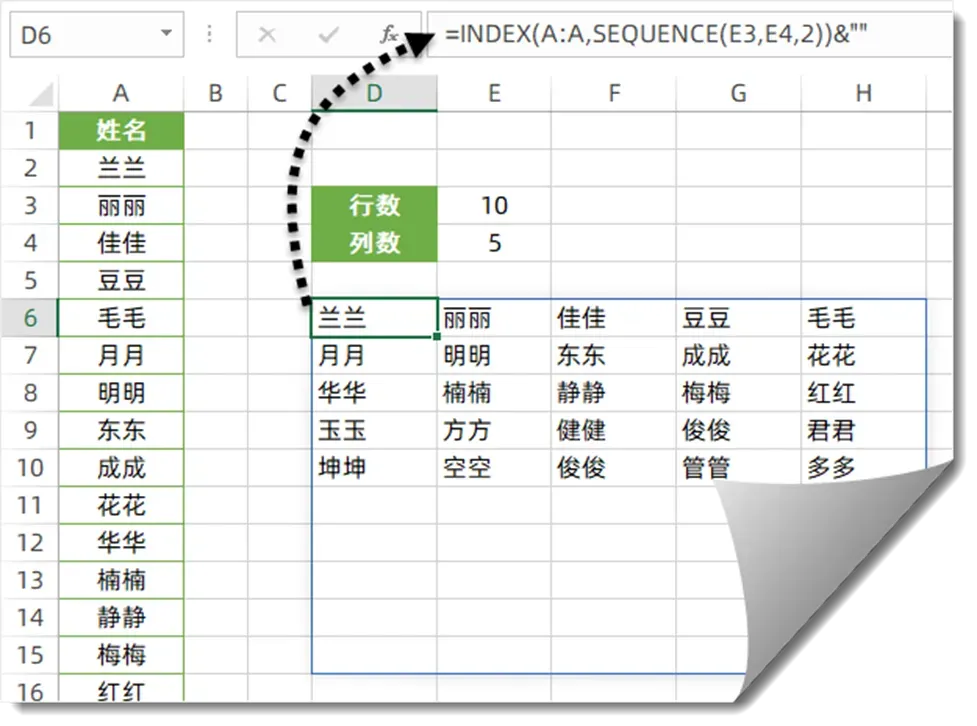 场景:A 列有一长串姓名,直接打印要好几页,想把它转换成多行多列的格式,省纸又好看。公式(对应示例里的 D6 单元格):