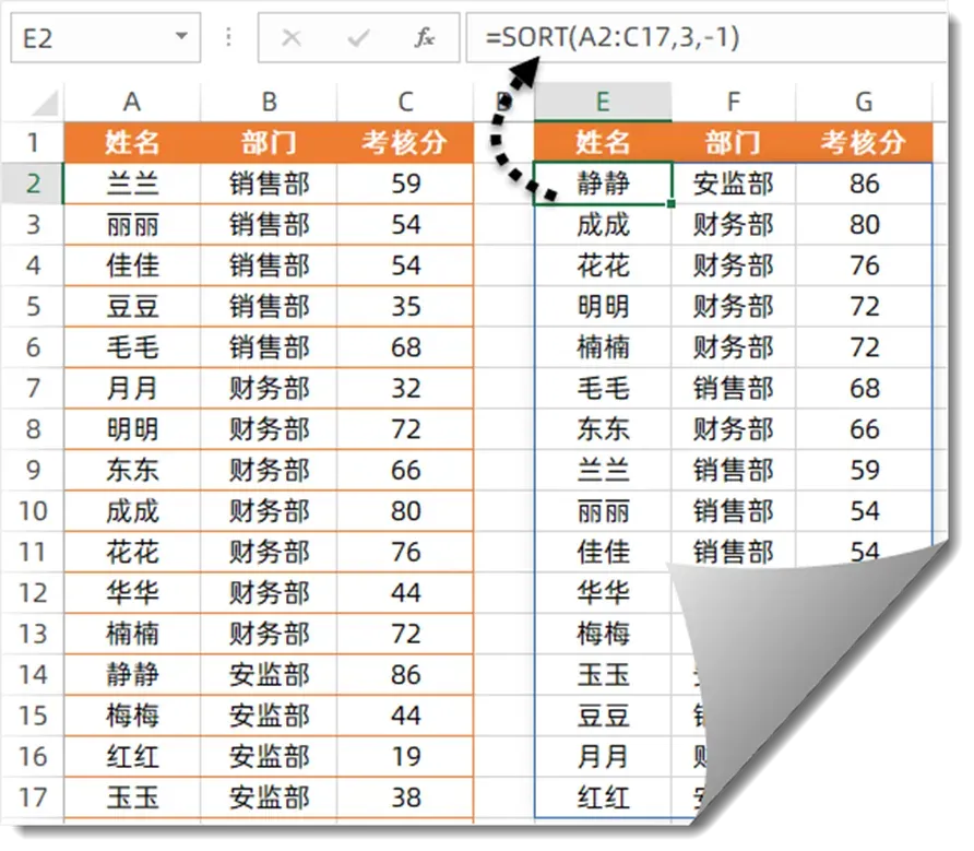 场景:A 列是姓名、B 列是部门、C 列是考核分,想一键按考核分从高到低,把整行的人员记录都排好。公式(对应示例里的 E2 单元格):
