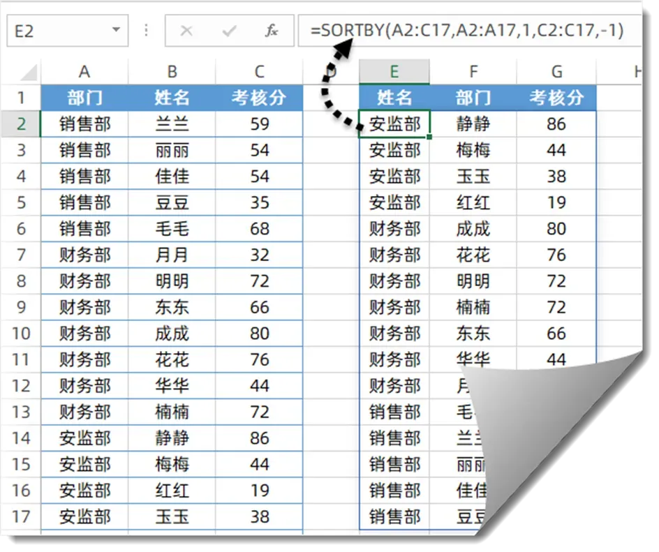 场景:还是刚才的人员考核表,想先按部门升序排列(同部门的放一起),同一个部门里,再按考核分降序排列(分数高的在前)。公式(对应示例里的 E2 单元格):