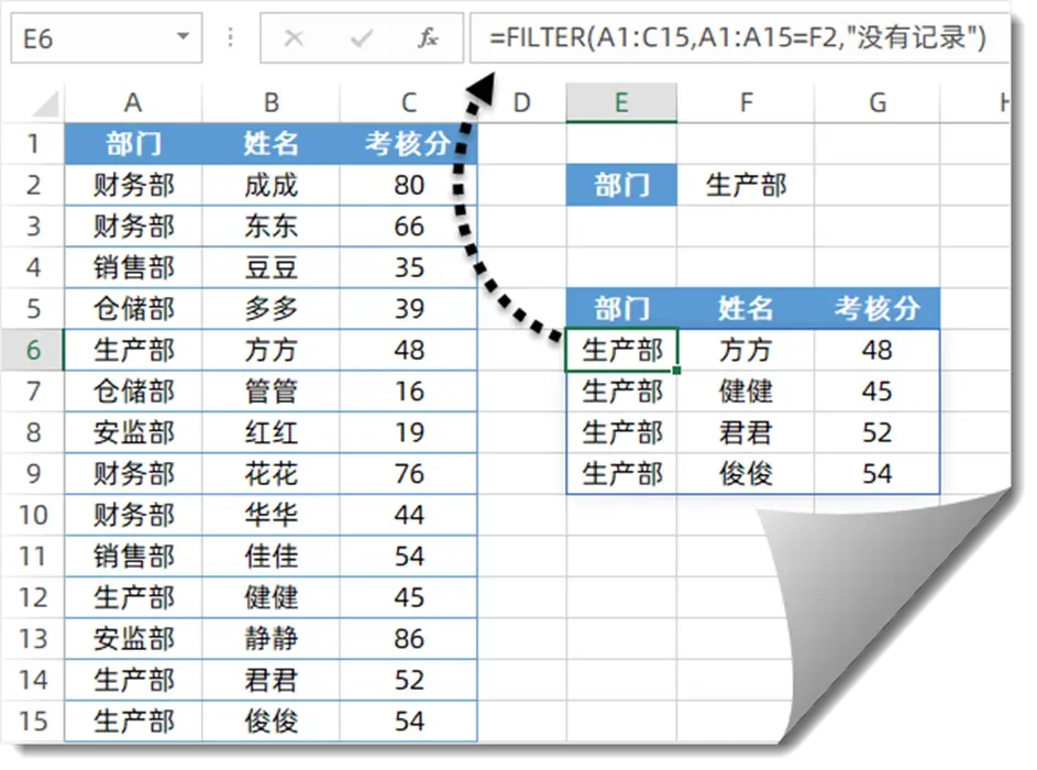 场景:A 列是部门、B 列是姓名、C 列是考核分,想在 F2 单元格输入部门名称,就自动把这个部门的所有人员记录,完整地筛选出来。公式(对应示例里的 E6 单元格):