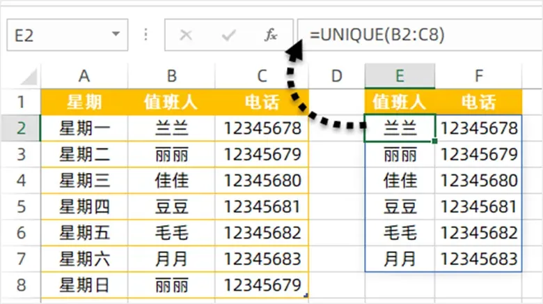 一步一步拆给你看:B2:C8就是所有值班人员的单元格区域,公式会自动遍历这个区域里的所有名字,重复的名字只保留一个,最终输出一份无重复的值班人员名单。