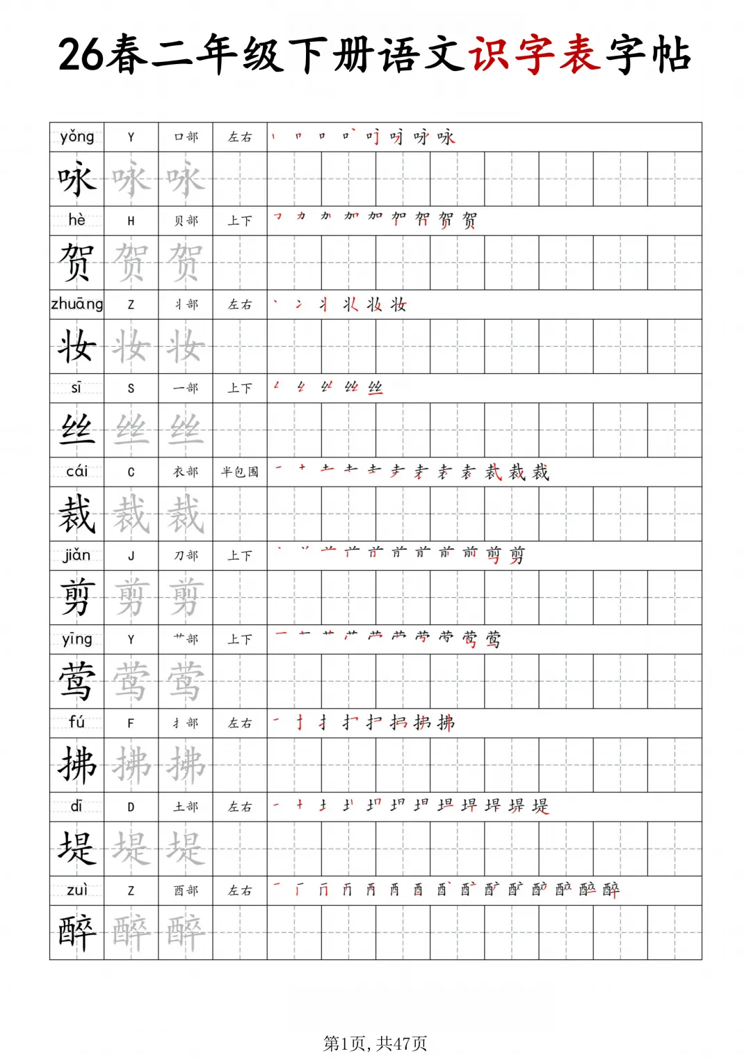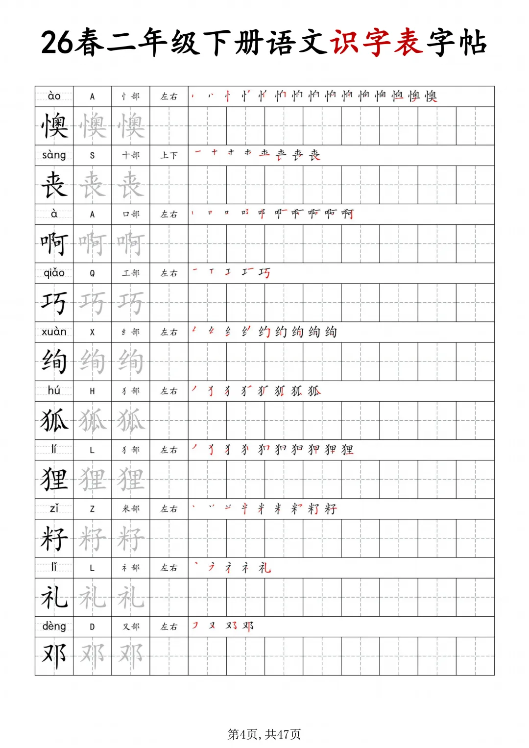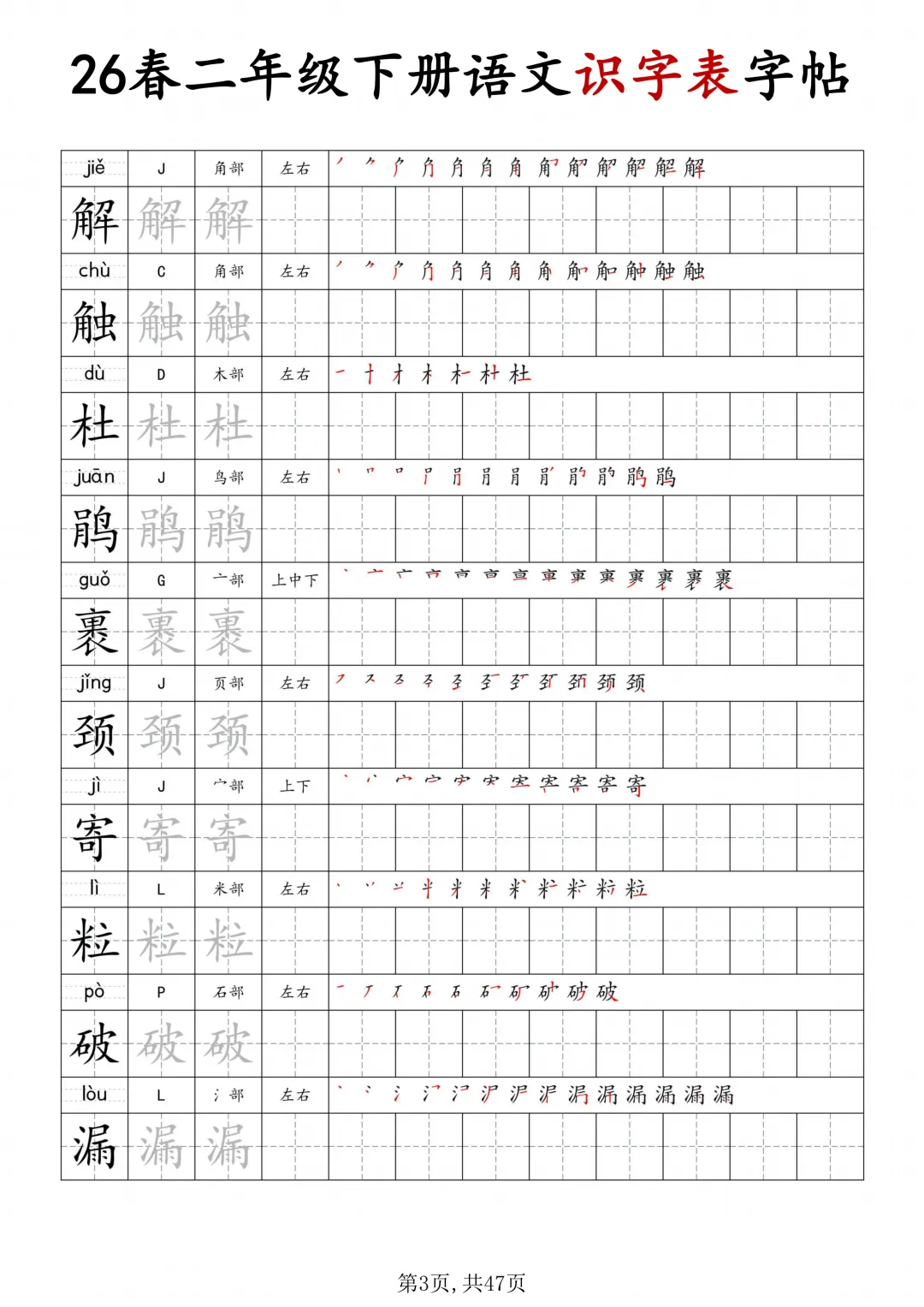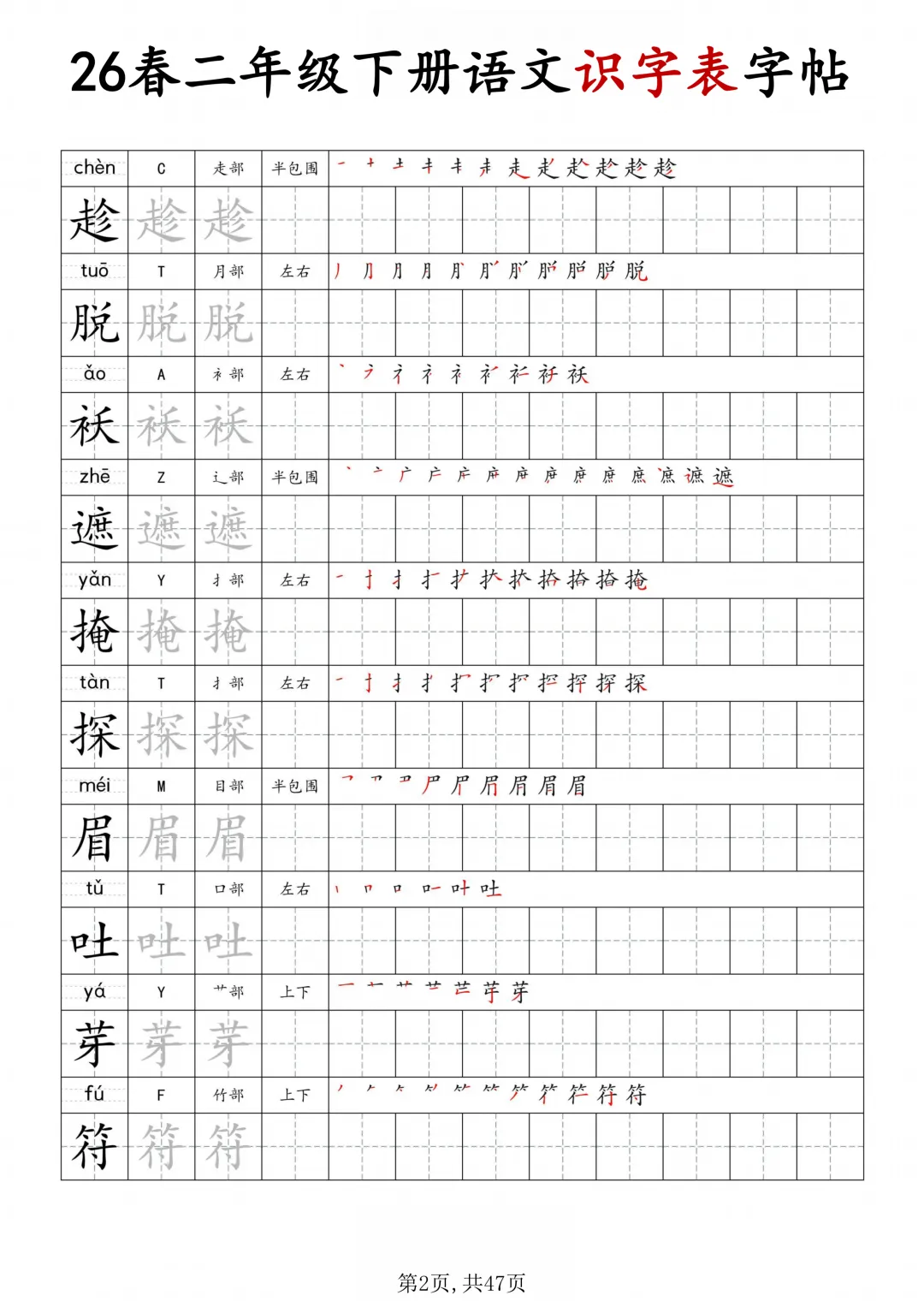 二年级下册语文识字表字帖(电子版可打印)