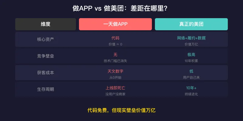 AI 能写代码,但 AI 不能给你变出来 1000 万商家、6 亿用户、600 万骑手。
