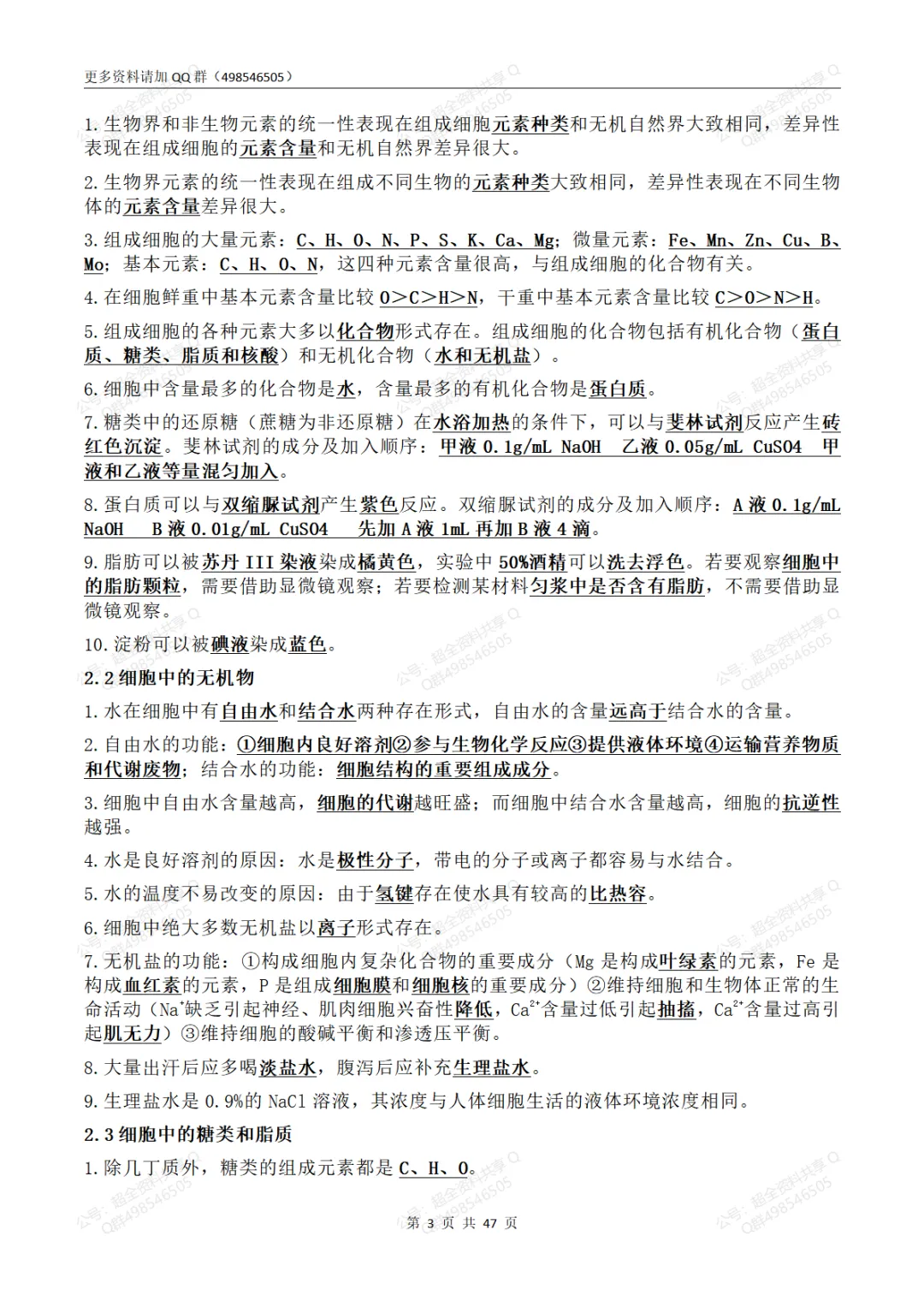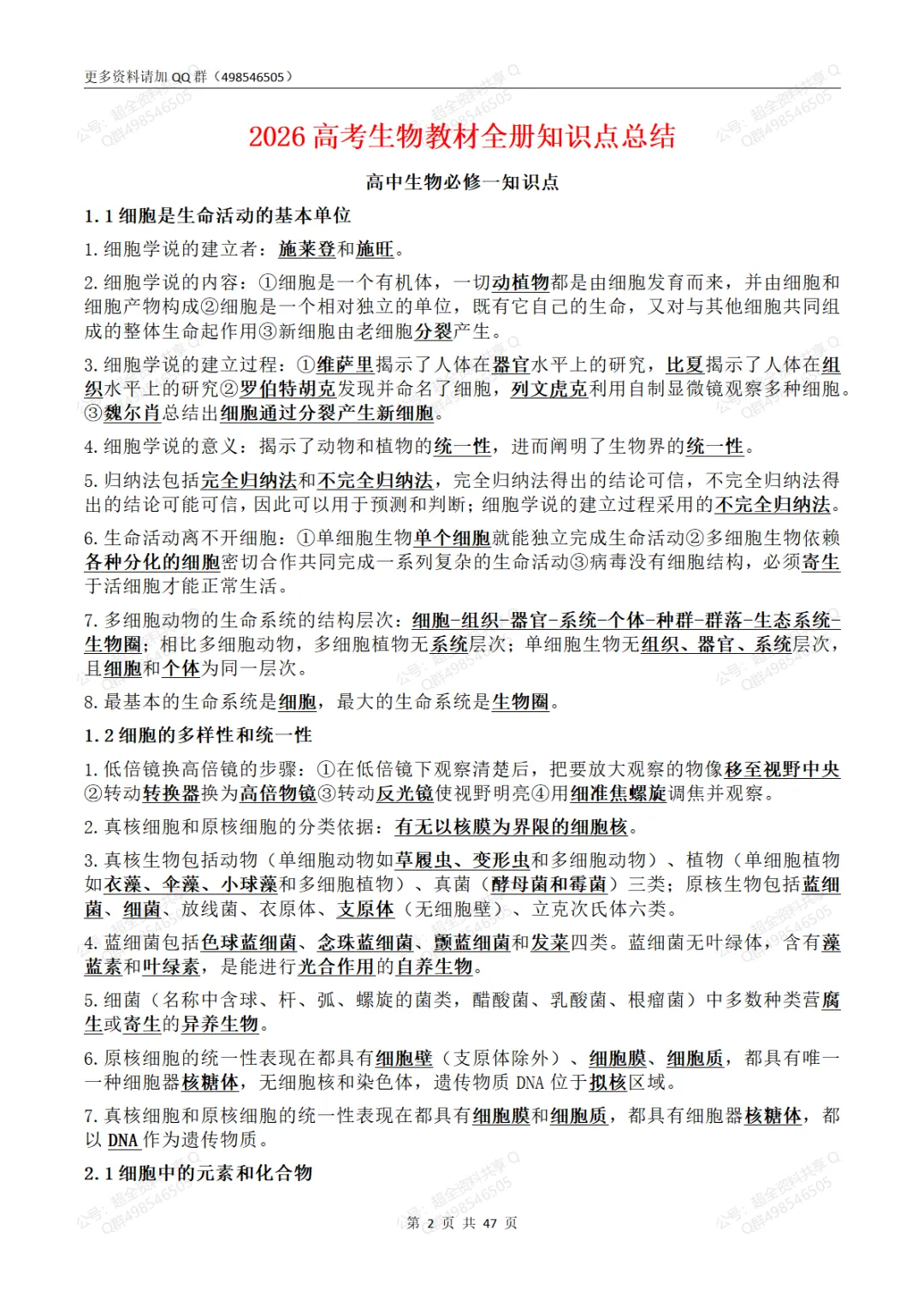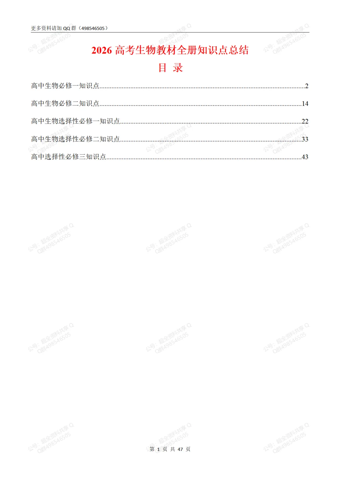 2026高考生物教材全册知识点总结(pdf分享) 【最新试卷】 2024北京东城高三【一模】全科试题及答案(pdf分享) 2024北京西城高三【一模】全科试题及答案(pdf分享) 2024北京海淀高三【一模】全科试题及答案(pdf分享) 2025北京海淀区高一(上)期末卷合集及答案(pdf分享) 2025北京海淀区高二(上)期末卷合集及答案(pdf分享) 2025北京海淀区高三(上)期末卷合集及答案(pdf分享) 2025北京东城区高一(上)期末卷合集及答案(pdf分享) 2025北京东城区高二(上)期末卷合集及答案(pdf分享) 2025北京东城区高三(上)期末卷合集及答案(pdf分享) 2025北京朝阳区高一(上)期末卷合集及答案(pdf分享) 2025北京朝阳区高二(上)期末卷合集及答案(pdf分享) 2025北京朝阳区高三(上)期末卷合集及答案(pdf分享) 2025届高三八省八校联考(全九科)试题及答案(pdf分享) 看文末有获取打印版方式 (完整版47页,部分展示) 上文和下面资料在QQ群498546505下载 【高中生物知识总结】 1.人教版高中生物必修1知识点(pdf分享) 2.人教版高中生物必修2知识点(pdf分享) 3.人教版高中生物必修3知识点(pdf分享) 4.人教版高中生物选修1知识点(pdf分享) 5.人教版高中生物选修3知识点(pdf分享) 6.高中生物必修2基础知识点测试(附答案)(pdf分享) 7.高中生物全部知识盲点、错点大整合(pdf分享) 8.高一生物人教版必修二必背知识点清单(pdf分享) 9.高中生物课本“黑体字”整理(pdf分享) 10.高中生物实验归类(填空、含答案)(pdf分享) 11.高中生物核心知识点177个(pdf分享) 12.高三一轮复习生物知识点汇总(pdf分享) 13.高考生物必备专题知识清单+思维导图(pdf分享) 14.高中生物三年289个名词解释超全整理(pdf分享) 15.高考生物绝密知识点【必修一至必修三】 16.高中生物必修一二三课本重点(pdf分享) 17.高中生物高考失分要点汇总(pdf分享) 18.高考生物边角知识问题+答案汇总(pdf分享) 19.高中生物必修123+选修13名词解释汇总(pdf分享) 20.高中生物学考知识点总结(完整版)(pdf分享) 21.高中生物实验大全 22.高中生物必修一超全名词解释(pdf分享) 23.高中生物知识网络体系(全)(pdf分享) 24.新教材人教版高中生物必修一 《分子与细胞》 知识点 25.新教材人教版高中生物必修二 《遗传与进化》 知识点(pdf分享) 26.新教材人教版 高中生物选择性必修1《稳态与调节》 知识点(pdf分享) 27.新教材人教版高中生物选择性必修2《生物与环境》 知识点(pdf分享) 28.新教材人教版高中生物选择性必修3《生物技术与工程》 知识点(pdf分享) 29.高中生物20个实验重点知识汇总(共21页)(pdf分享) 30.高中生物105个基础知识点+22“特例”+18个高频考点(pdf分享) 31.高考生物边角知识问题汇总(含答案)(pdf分享) 32.高中生物实验题分类汇编+答题策略(pdf分享) 33.高中生物必备500个判断题集锦,涵盖高中全部知识点!(pdf分享) 34.高中生物80条常考结论(pdf分享) 35.高中生物学考知识点总结(完整版)(pdf分享) 36.高中生物教材必修1-3知识点总结(背诵版)(pdf分享) 37.高中生物学考知识点归纳整理(旧版教材)(pdf分享) 38-高中生物课本214条知识整理(pdf分享) 39.高二生物会考知识点归纳(pdf分享) 40.2023年高考生物易混知识点辨析与精练(pdf分享) 41.80条高中生物常考结论,背进脑子里,答题快准稳!(pdf分享) 42.高考生物长句子规范表述,教材资源分类解答(pdf分享) 43.高考生物高中三年必修1-3知识点大总结总(pdf分享) 44.高考生物核心知识点、送分结论、细枝末节、万能答题模板整理(pdf分享) 45.高中生物易混淆知识点辨析、易错知识点、常考结论总结(pdf分享) 46-高中生物超全(必修1-3)知识点汇总(pdf分享) 47.高中生物超全计算公式总结(pdf分享) 48.高中生物一轮超全复习宝典)(pdf分享) 49.高中生物基础100道好题(pdf分享) 50.高中生物实验易错点归纳(pdf分享) 51.高中生物教材实验知识点梳理(pdf分享) 52.高中生物精要知识点(必修123及选修1)(pdf分享) 53.(超详)高中生物知识点归纳汇总(pdf分享) 54.高中生物会考复习知识点(pdf分享) 55.北京市高考知识点梳理(生物)(pdf分享) 56.高中生物177条必备生物知识点汇总(pdf分享) 57.高三生物冲刺知识点总结(全)(pdf分享) 58.苏教版高中生物必修二知识点总结(pdf分享) 59.苏教版高中生物必修三知识点总结(pdf分享) 60.高中生物知识结构网络图(完整版)(pdf分享) 61.新教材人教版高中生物必修一《分子与细胞》知识点(pdf分享) 62.新教材人教版高中生物必修二《遗传与进化》知识点(pdf分享) 63.新教材人教版高中生物选择性必修1《稳态与调节》知识点(pdf分享) 64.新教材人教版高中生物选择性必修2《生物与环境》知识点(pdf分享) 65.新教材人教版高中生物选择性必修3《生物技术与工程》知识点(pdf分享) 66.高三生物必背知识点(pdf分享) 67.高中生物选修1-3知识点总结(详细)(pdf分享) 68.高中生物实验大全(pdf分享) 69.高中生物新教材知识点思维导图梳理(pdf分享) 70.清华北大附中理科学霸高中生物笔记(pdf分享) 71.高中生物实验中有关试剂的使用,十张表帮你搞定!(pdf分享) 72.2023高中生物专项训练103套(含答案解析)(pdf分享) 73.高中生物知识点概念图+核心知识点汇总(pdf分享) 74.高中生物全知识导图(pdf分享) 75.高中生物笔记大全(也适合高一高二高三)(pdf分享) 76.新教材人教版高中生物知识点梳理总结(pdf分享) 77.高考复习高中生物基础30练(附参考答案与解析)(pdf分享) 78.高考生物一轮复习新教材人教版高中