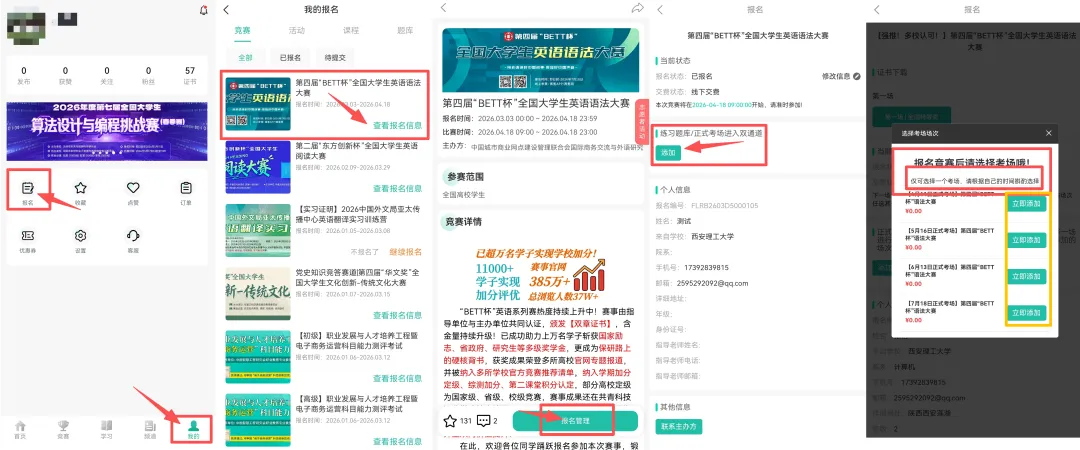 添加步骤:赛氪APP–登录报名赛事账号–我的–报名–竞赛–本次语法大赛–进入官网,点击报名管理,在正式考场添加处选择自己想要参与的场次进行添加
