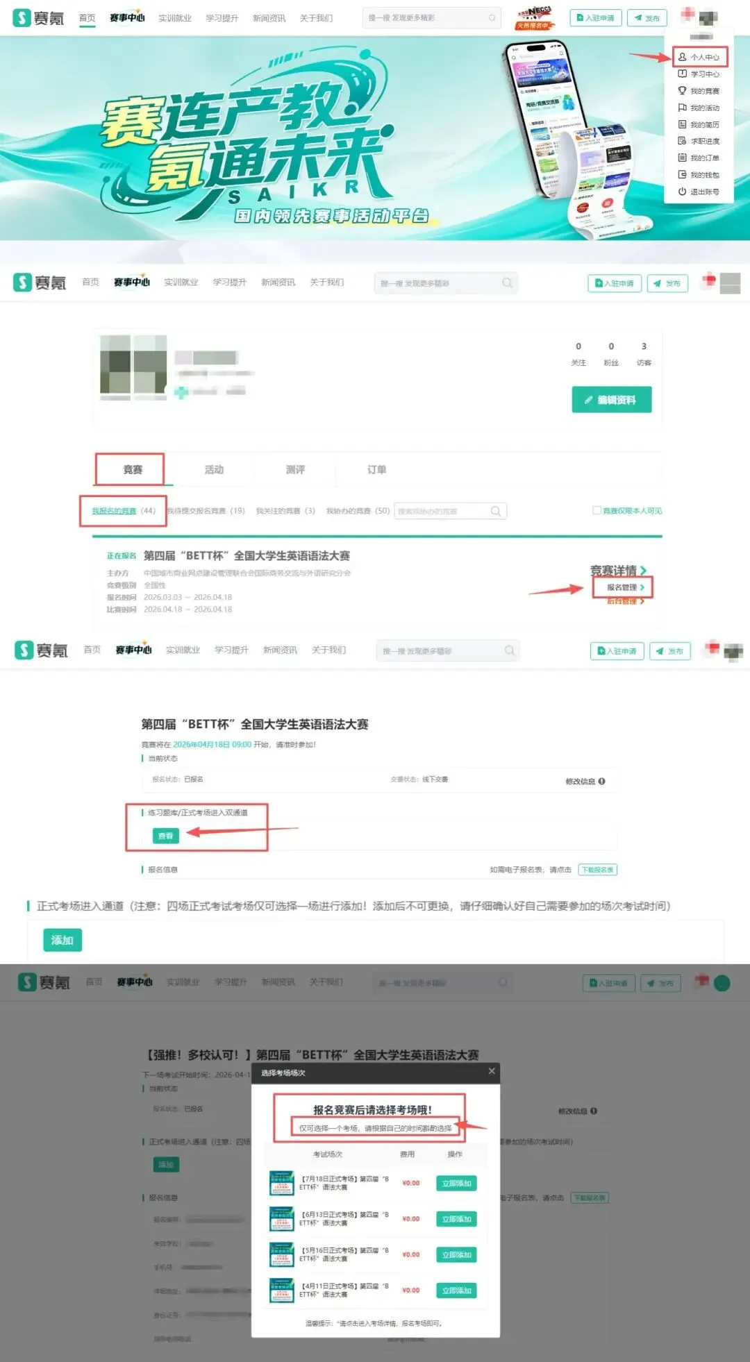 添加步骤:浏览器搜索赛氪网–进入官网–右上角登录报名账号–点击进入个人中心–竞赛–我报名的竞赛中进入本次语法大赛官网,点击报名管理,在正式考场添加处选择自己想要参与的场次进行添加
