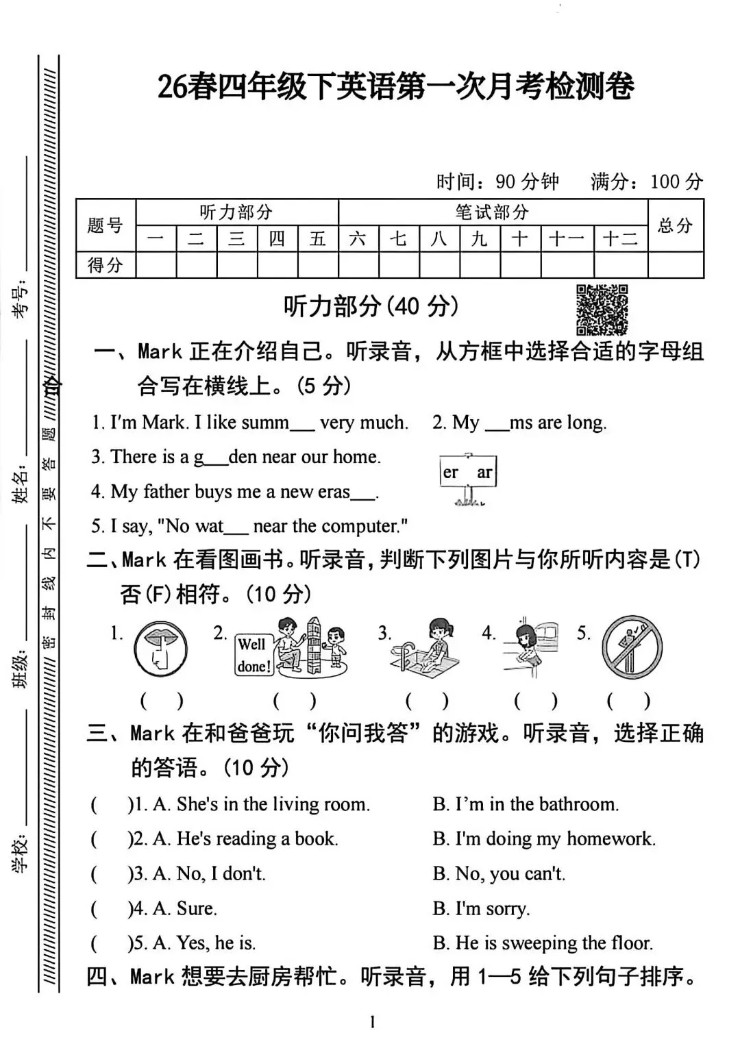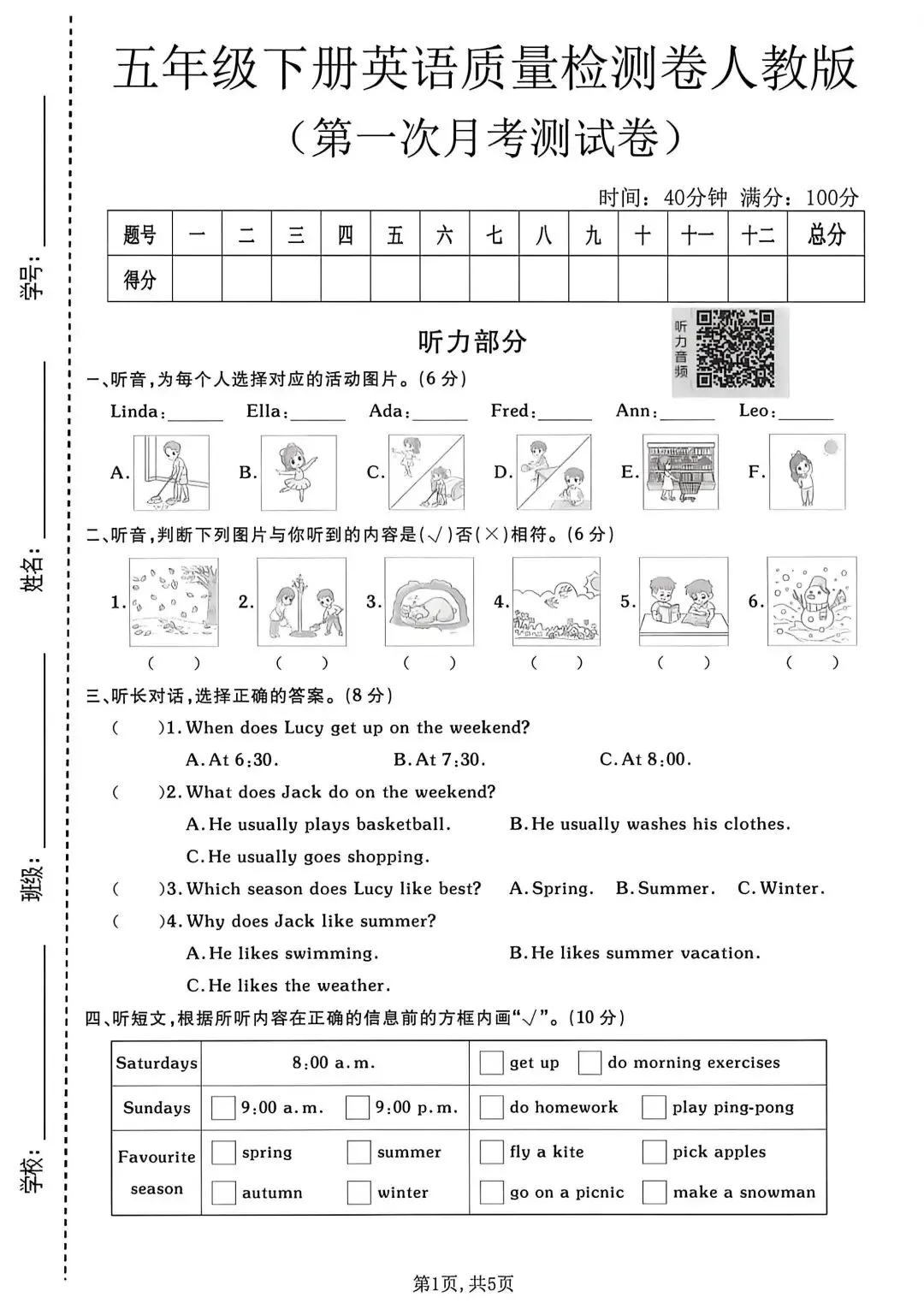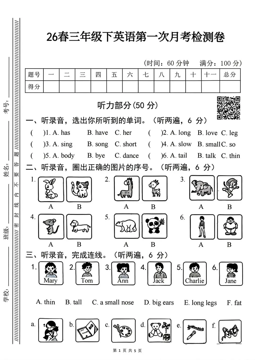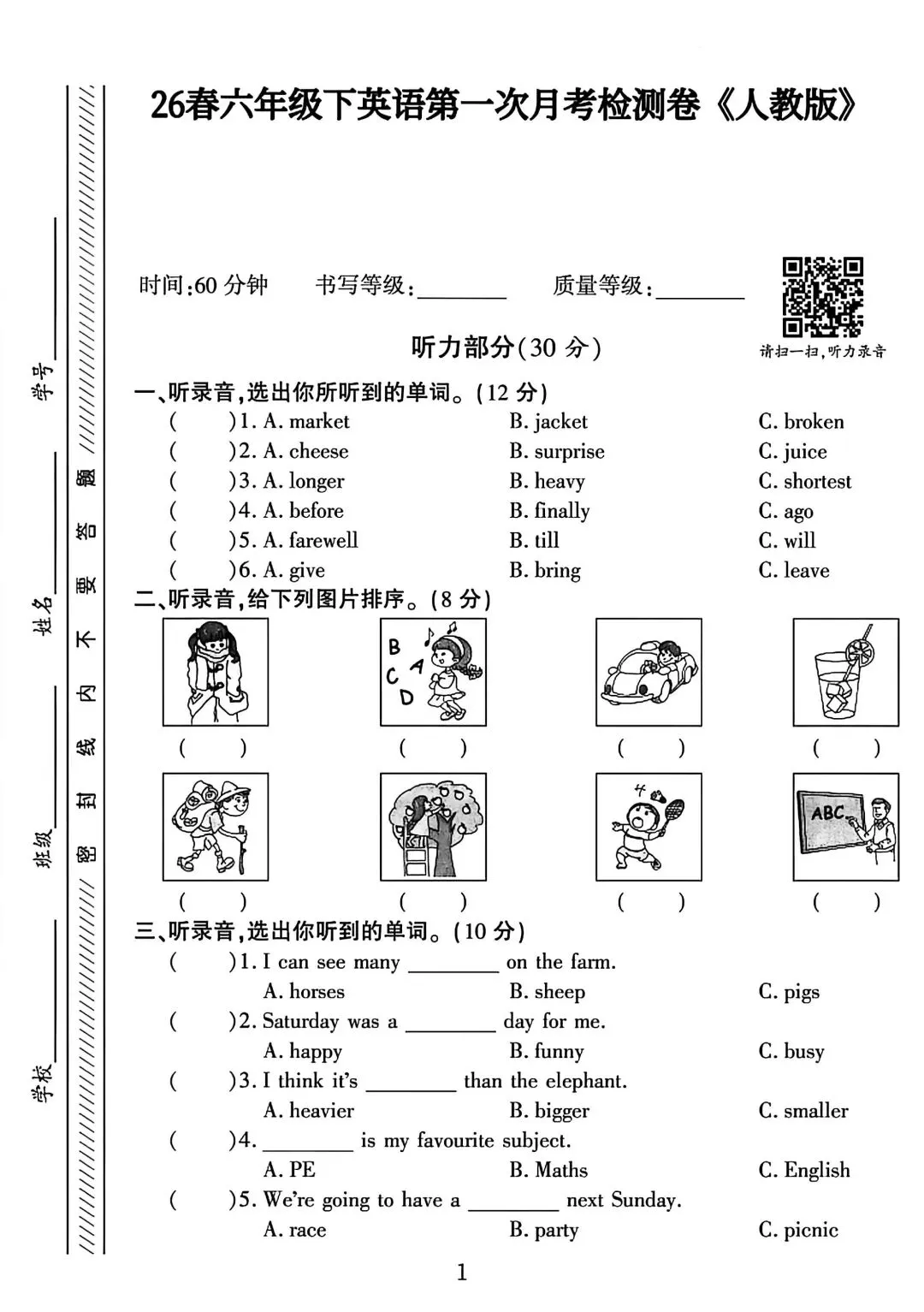 人教版3—6年级英语下册第一次月检测(可下载)