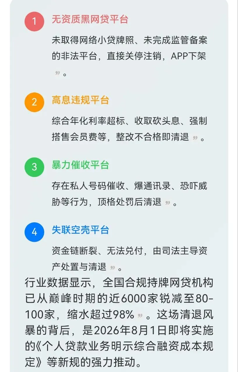 广西事件只是冰山一角。2026年以来,全国范围内网贷平台清退加速,监管呈现“零容忍”态势。根据最新监管动态,四类平台正在被重点清理:
