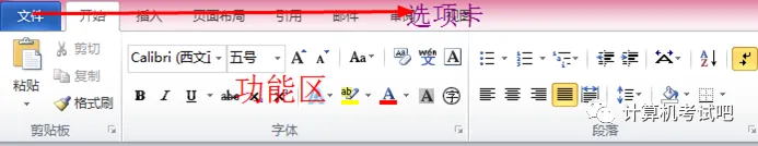 功能区以选项卡的方式对命令进行分组和显示,在Word 2010功能区中拥有“开始”、“插入”、“页面布局”、“引用”、“邮件”和“审阅”等编辑文档的选项卡。