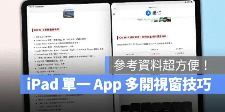 对于平常会用iPad 查资料、写内容或处理文件的人来说,多开视窗能让整体效率更上一层楼,推荐大家可以自己尝试看看。