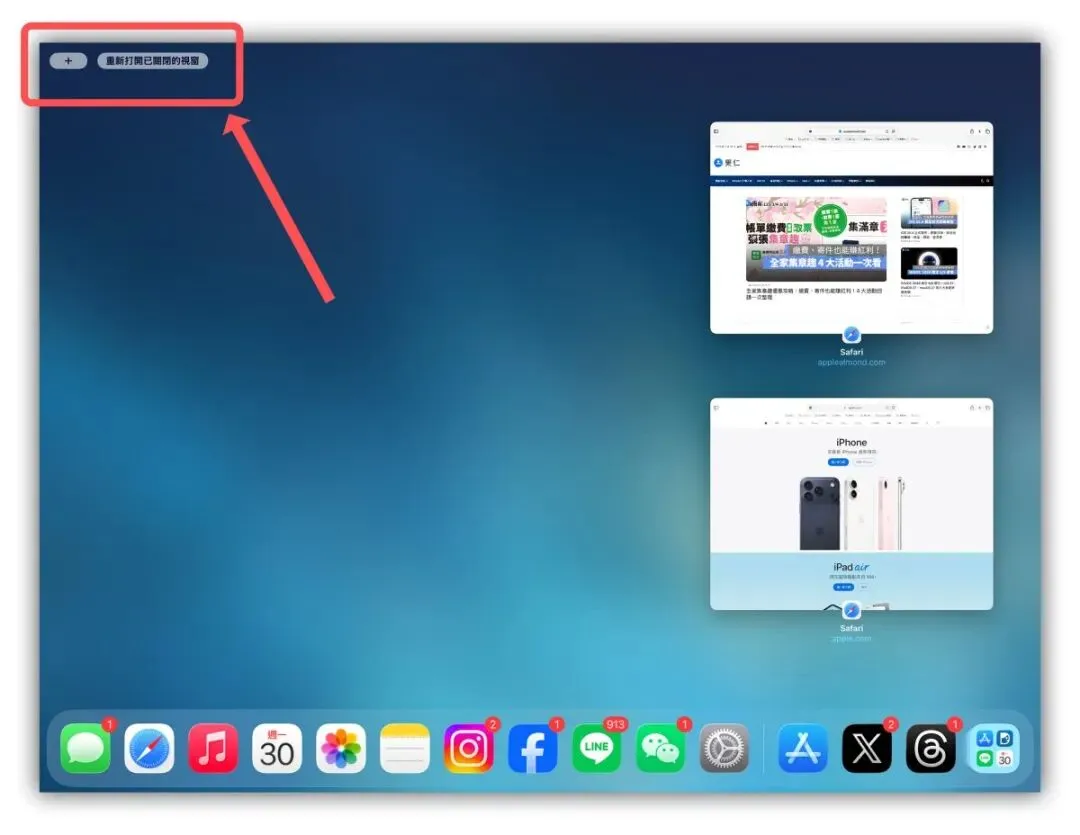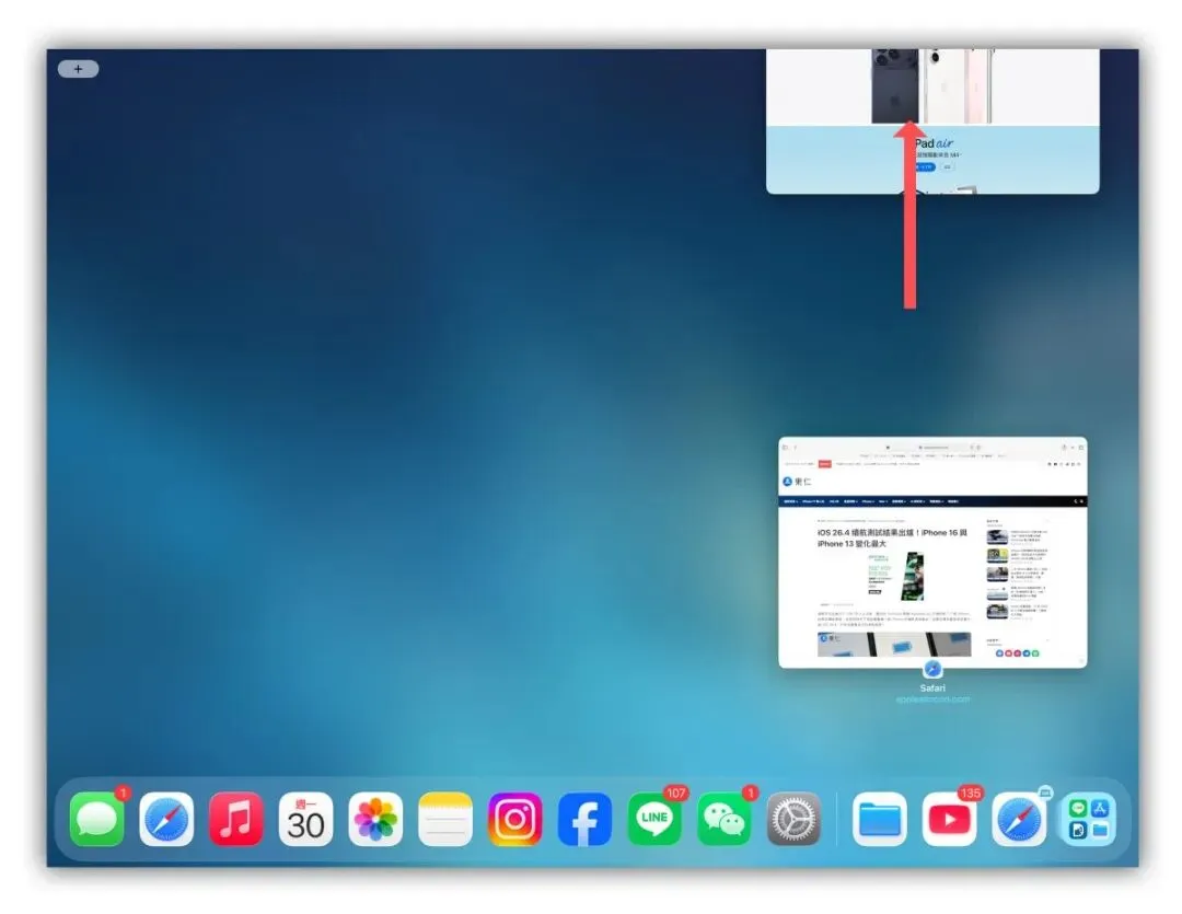 首先确认iPad 有更新到iPadOS 26 以上版本;接着我以Safari 为例,打开Safari 后,上拉Dock 栏并再点一次Safari 的icon,系统就会显示目前所有开启的Safari 视窗。