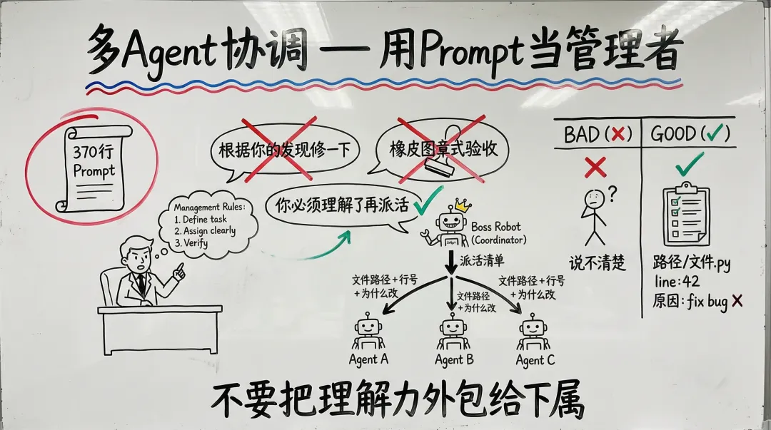 “永远不要写’根据你的发现去修复这个bug’。这种话是在把理解力外包给下属。你必须自己理解了研究结果,然后写清楚:改哪个文件、第几行、为什么改、改成什么。”