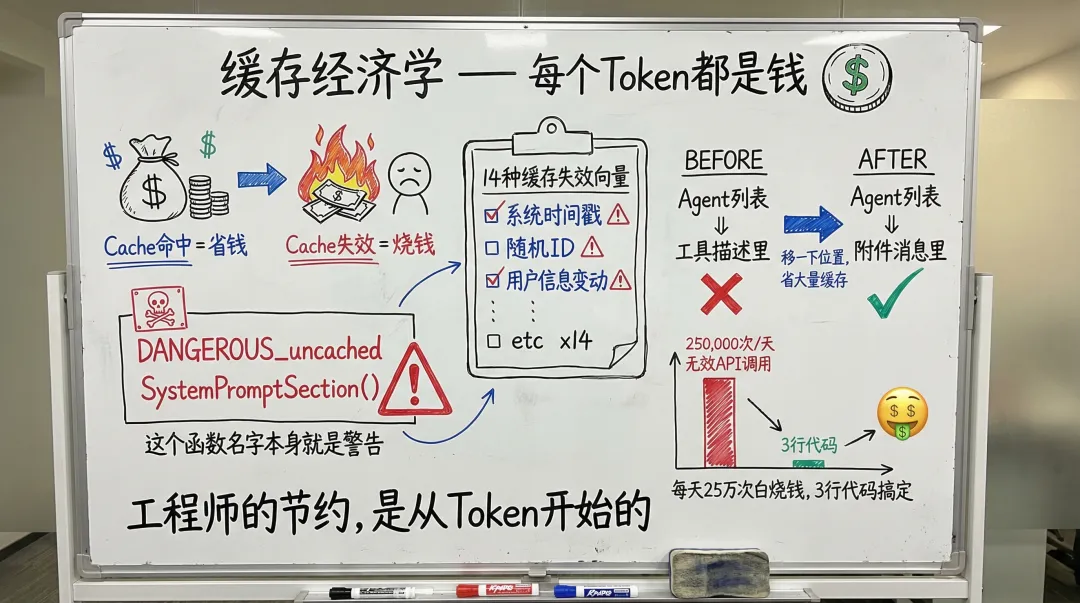 Claude Code追踪了14种缓存失效的原因。有一个函数名字就叫DANGEROUS_未缓存系统提示区——意思是:碰这个地方之前你得想清楚,改了缓存就炸了。