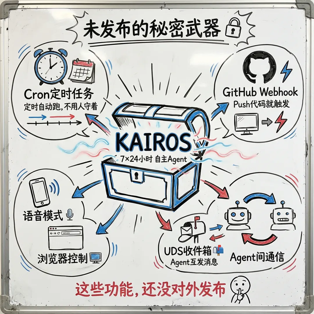 源码里有个叫KAIROS的功能——AI可以7×24小时在后台运行,自己设定时任务,自己监听GitHub事件(比如有人提了PR、CI跑完了),主动给你发推送通知,每天还自动做”记忆蒸馏”——把一天学到的东西整理归档。
