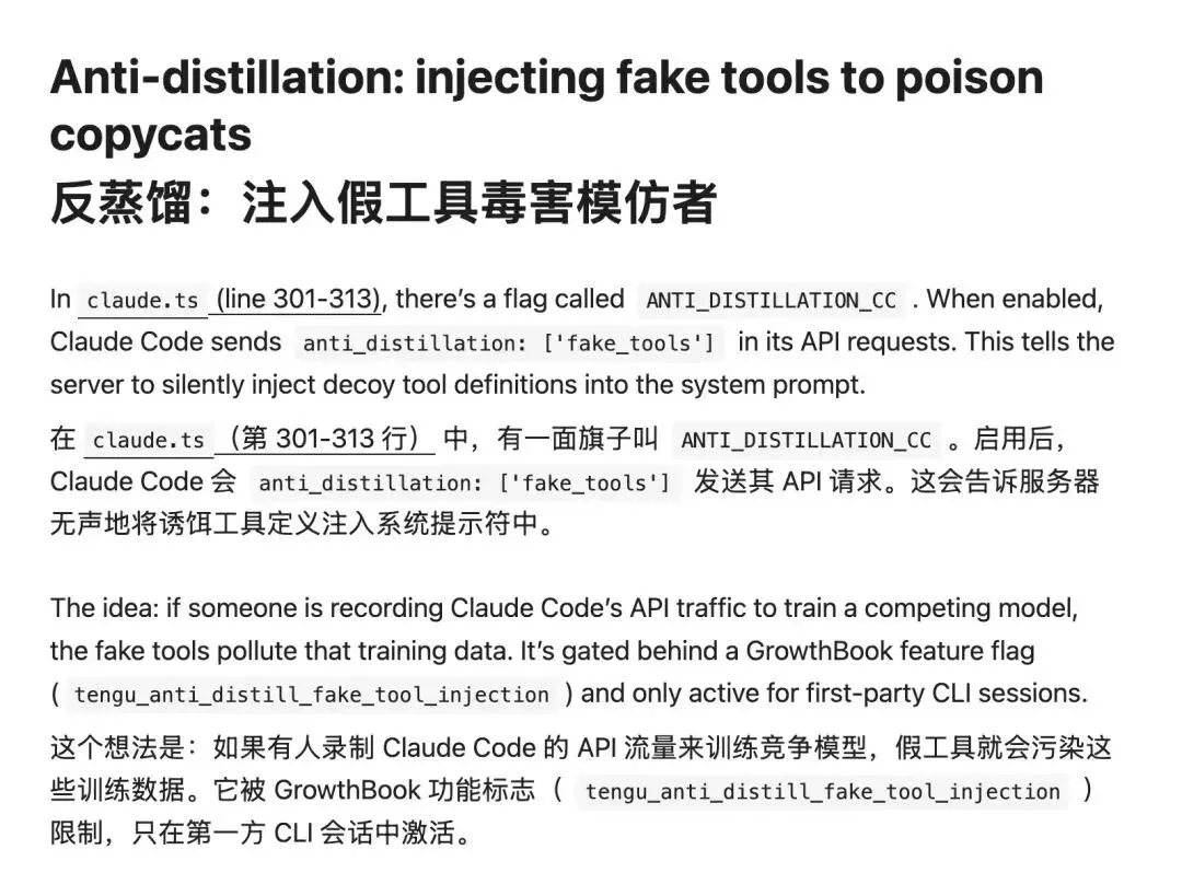 还有反蒸馏机制——如果有人偷录Claude Code的API流量想拿去训练自己的模型,它会往请求里注入假的工具定义,污染你的训练数据。用技术手段反偷师。