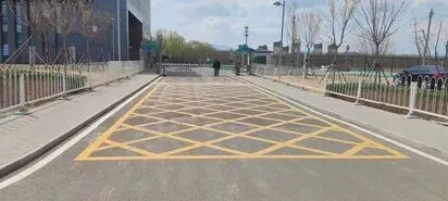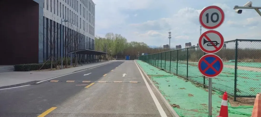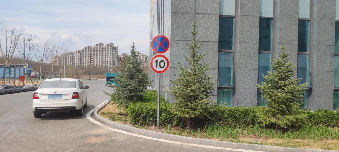 此处为交通标牌及地面交通标线。校区内部限速10KM/h、禁止鸣笛、地面不允许停车,应按照地面交通标线行车。