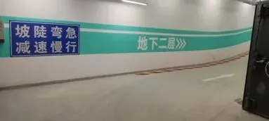 此处为坡道安全提示标牌及指引喷涂,坡道行驶,请减速慢行,注意安全。