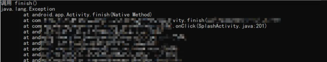 Java.perform(function () {var Activity = Java.use("android.app.Activity");var Log = Java.use("android.util.Log");var Exception = Java.use("java.lang.Exception");Activity.finish.overload().implementation = function () {console.log("调用 finish()");console.log(Log.getStackTraceString(Exception.$new()));return this.finish();};});