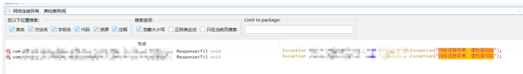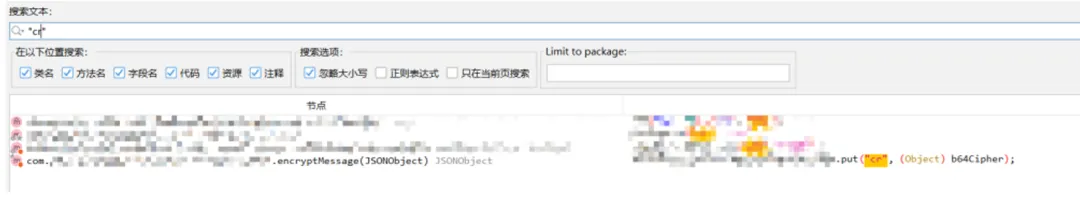 接下来,继续在Jadx里找线索,重点从请求报文中的参数入手搜索相关字符串;如果响应报文没有明显特征参数,那思路就是去找response、body、decrypt、encrypt、cipher等关键字;再结合方法命名、参数类型、调用位置,基本就是连蒙带猜 + 逻辑分析慢慢定位加解密位置。