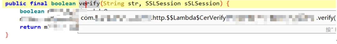 Java.perform(function () {var hooked = {};Java.enumerateLoadedClasses({onMatch: function (name) {if (name.startsWith("com.xxx.http.-$$Lambda$CerVerify$") &&!hooked[name]) {hooked[name] = true;console.log("[+] Hit:", name);try {var cls = Java.use(name);if (cls.verify) {cls.verify.overloads.forEach(function (overload) {overload.implementation = function (hostname, session) {console.log("[+] Bypass verify:", hostname);return true;};});}} catch (e) {console.log("[-] Hook failed:", name);}}},onComplete: function () {console.log("[*] Done");}});});