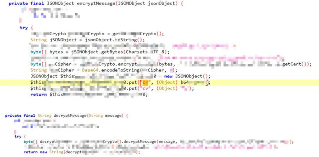 f"""Java.perform(function () {{var manualEncryptFlag = false;var manualDecryptFlag = false;var globalCrypto = null;var globalInterceptor = null;var globalCert = null;// ==========================// Encrypt Function// ==========================var encryptOverload = CommInterceptor.encryptMessage.overload('{CLASS_FASTJSON_OBJECT}');encryptOverload.implementation = function (data) {{try {{globalInterceptor = this;globalCrypto = this.getCrypto();}} catch (e) {{console.log("getCrypto error:", e);}}if (manualEncryptFlag) {{console.log("{RPC_FLAG_ENCRYPT}");var result = encryptOverload.call(this, data);console.log("{HTTP_FLAG_REQUEST_CIPHER_TEXT}");console.log(result);return result;}}console.log("{HTTP_FLAG_REQUEST_PLAIN_TEXT}");console.log(data.toString());var jsonObj = FASTJSONObject.$new(data);return jsonObj;}};// ==========================// Decrypt Function// ==========================var decryptOverload = CommInterceptor.decryptMessage.overload('{CLASS_JAVA_STRING}');decryptOverload.implementation = function (data) {{if (manualDecryptFlag) {{console.log("{HTTP_FLAG_RESPONSE_CIPHER_TEXT}");console.log(data);console.log("{RPC_FLAG_DECRYPT}");//var result = decryptOverload.call(this, data);var resultToString = globalCrypto.decryptMessage(data, globalCert);var result = StringClass.$new(resultToString, Charsets.UTF_8.value);return result.toString();}}console.log("{HTTP_FLAG_RESPONSE_PLAIN_TEXT}");console.log(data.toString());return data.toString();}};// ==========================// Frida RPC加解密对外接口// ==========================rpc.exports = {{encrypt: function(data) {{try {{var fastJsonObj = FASTJSONObject.parseObject(data);var instance = CommInterceptor.$new();manualEncryptFlag = true;var result = encryptOverload.call(instance, fastJsonObj);return result ? result.toString() : "";}} catch (e) {{console.log("Encrypt Error:", e);console.log(e.stack);return "{RPC_FLAG_ENCRYPT_ERROR}:" + e;}} finally {{manualEncryptFlag = false;}}}},decrypt: function(data) {{try {{var instance = CommInterceptor.$new();manualDecryptFlag = true;var result = decryptOverload.call(instance, data);return result ? result.toString() : "";}} catch (e) {{console.log("Decrypt Error:", e);console.log(e.stack);return "{RPC_FLAG_DECRYPT_ERROR}:" + e;}} finally {{manualDecryptFlag = false;}}}}}};}});"""