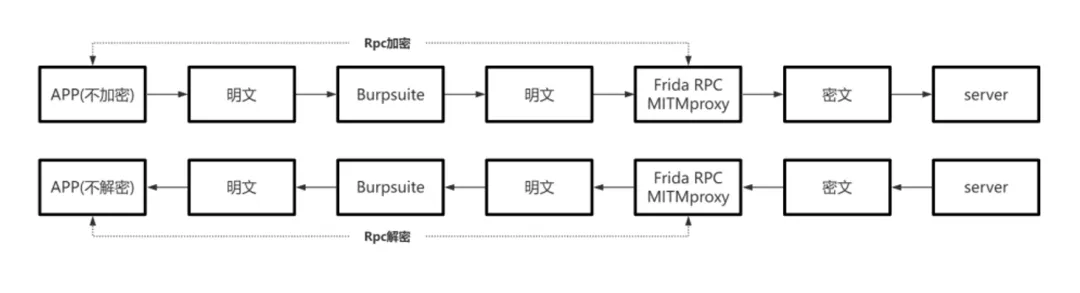 这样Burp里永远看到的都是明文,请求响应都能改,APP也不会崩,服务器也完全不知道中间发生了什么。这个方案的核心思路可以总结为一句话:拿不到密钥没关系,让APP帮咱们完成对应加解密就行,不需要深度逆向出具体的加解密算法,咱们只负责“遥控”他干活。