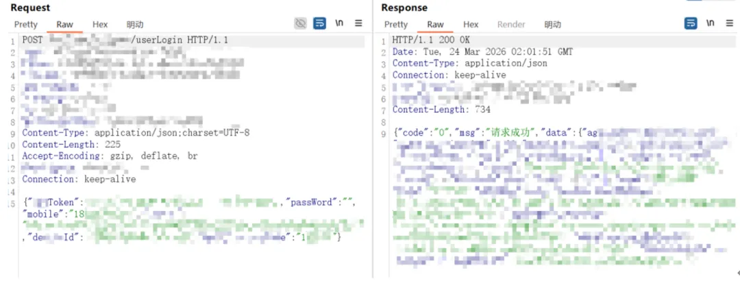 至此,整个代理链路与加解密流程全部打通,大功告成!此时在Burp中看到的请求和响应报文已经不再是加密后的密文,而是可以直接阅读、修改和重放等操作的明文数据。如下图:
