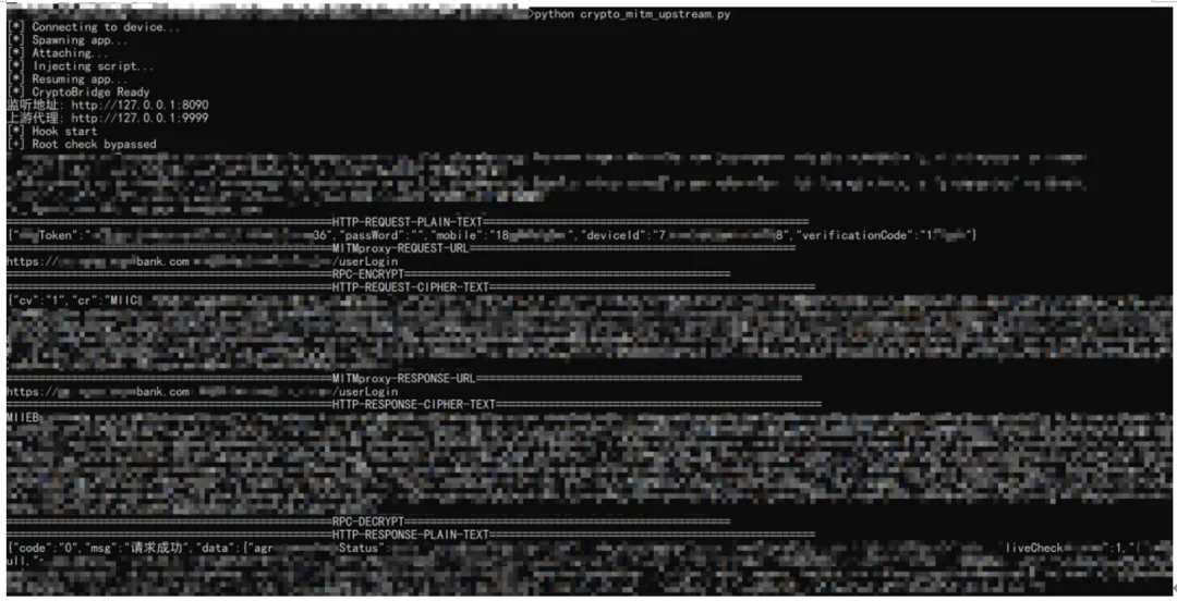 class CryptoBridge:def __init__(self, package_name=PACKAGE_NAME):print("[*] Connecting to device...")self.device = frida.get_usb_device(timeout=10)print("[*] Spawning app...")self.pid = self.device.spawn([package_name])print("[*] Attaching...")self.session = self.device.attach(self.pid)print("[*] Injecting script...")self.script = self.session.create_script(JS_CODE)self.script.load()print("[*] Resuming app...")self.device.resume(self.pid)self.api = self.script.exports_syncprint("[*] CryptoBridge Ready")# =========================# Rpc对外接口# =========================def encrypt(self, plaintext: str) -> str:return self.api.encrypt(plaintext)def decrypt(self, ciphertext: str) -> str:return self.api.decrypt(ciphertext)