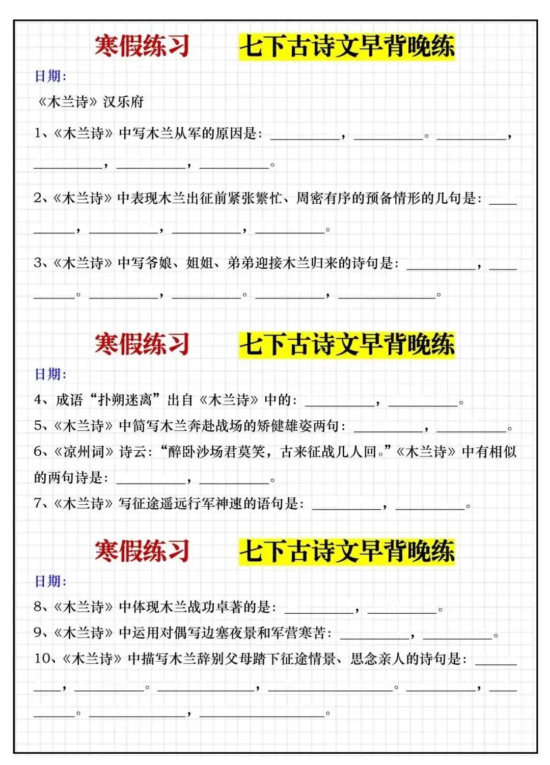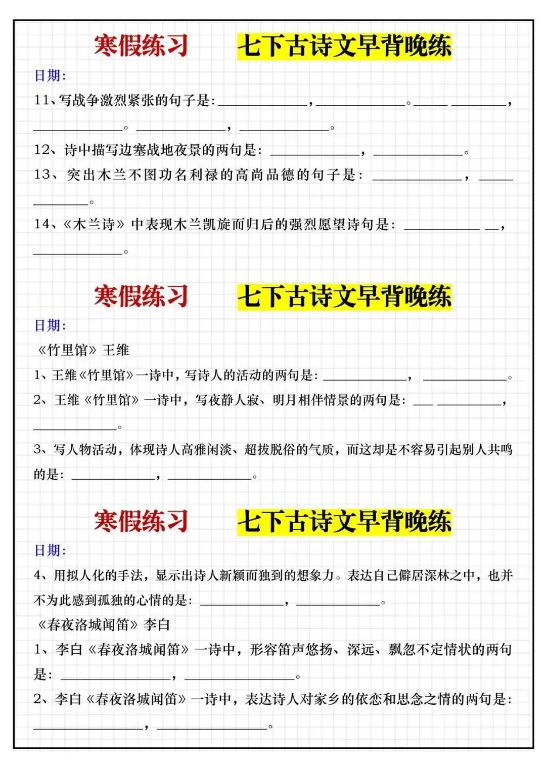 七下古诗文早背晚练 | 可打印 点击上方蓝字·关注我们 今天要分享的内容是七下古诗文早背晚练,覆盖教材全部必背篇目,按 “晨读 + 晚练” 科学规划,让孩子每天轻松积累、稳步提升。 内容截图 END 获取方式(限时发文24小时免费) 对话框中输入数字:24903