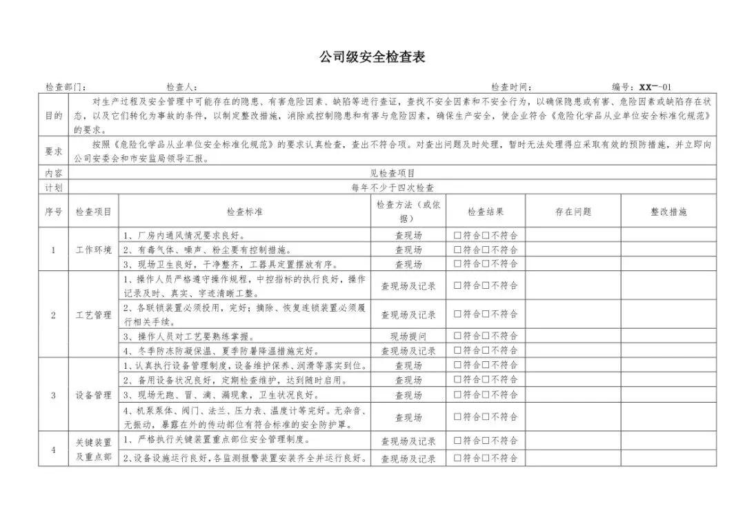 安全生产是企业发展的基石,从日常巡检到专项排查,一套科学完整的安全检查表,能帮企业快速识别隐患、规避风险,让安全管理工作更高效、更全面。小编整理了17套企业通用安全检查表汇总,覆盖公司、车间、班组三级检查,兼顾电气、消防、危化品、压力容器等全场景,内容贴合《危险化学品从业单位安全标准化规范》要求,无需二次整理,打印就能直接投入使用,为企业安全管理添上一层“防护盾”。