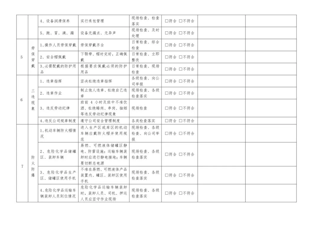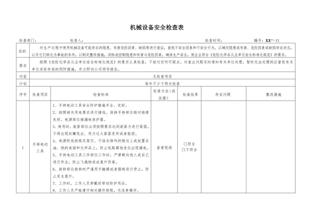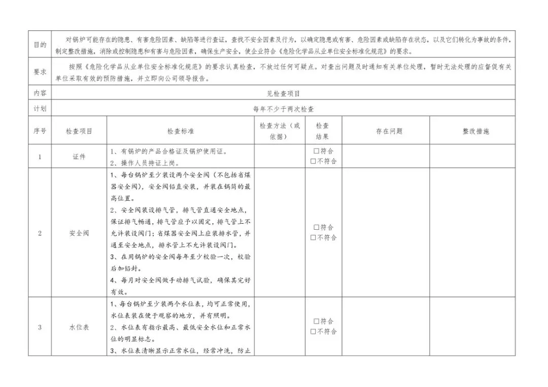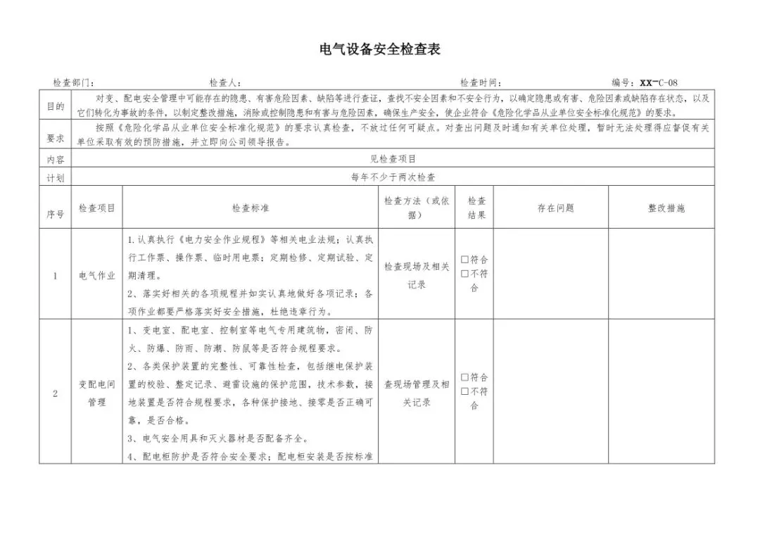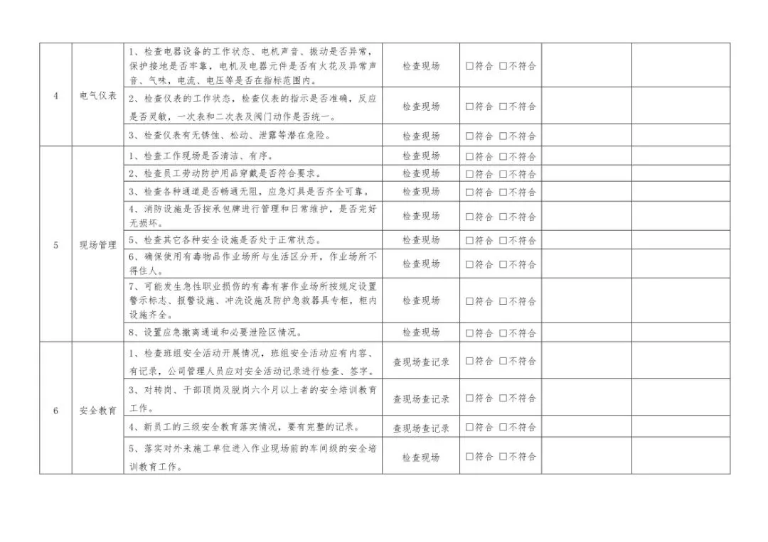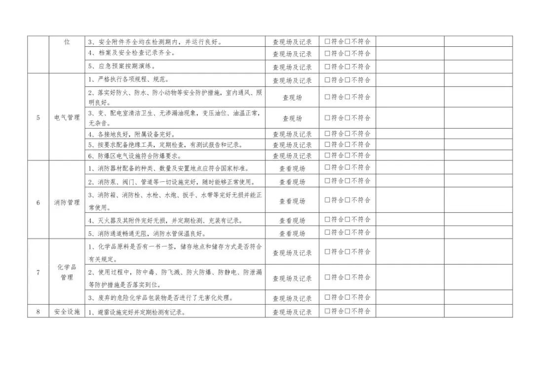 在设备与专项检查板块,更是做到了细分到项,电气设备、防火防爆及消防、防尘防毒、压力容器、危险化学品、机械设备、锅炉、监测仪表等关键领域,均有对应的专项检查表。每一份表格都明确了检查项目、检查标准、检查方法,设置了清晰的符合/不符合勾选栏,还有存在问题、整改措施填写区域,检查后能直接记录问题、落实整改,让安全检查从“走过场”变成“有依据、有记录、有整改”的闭环管理。