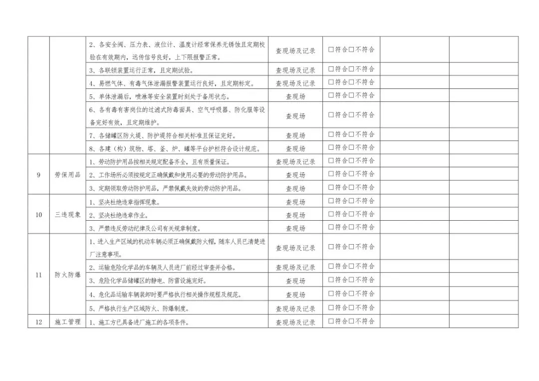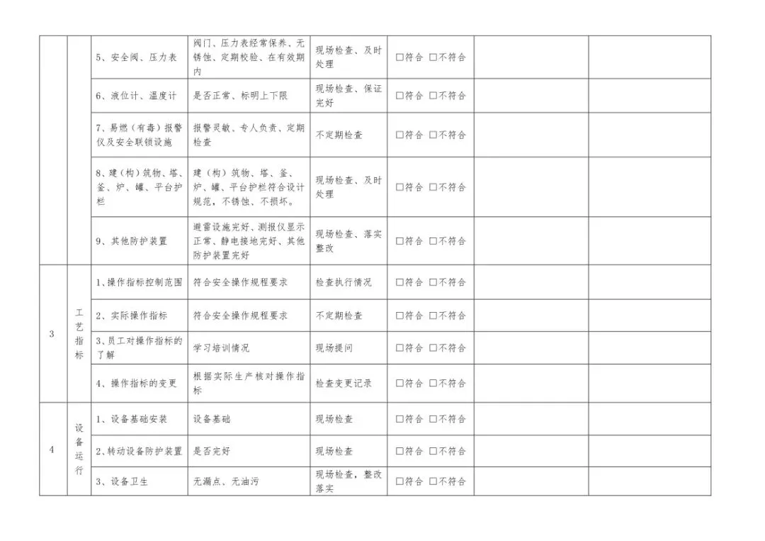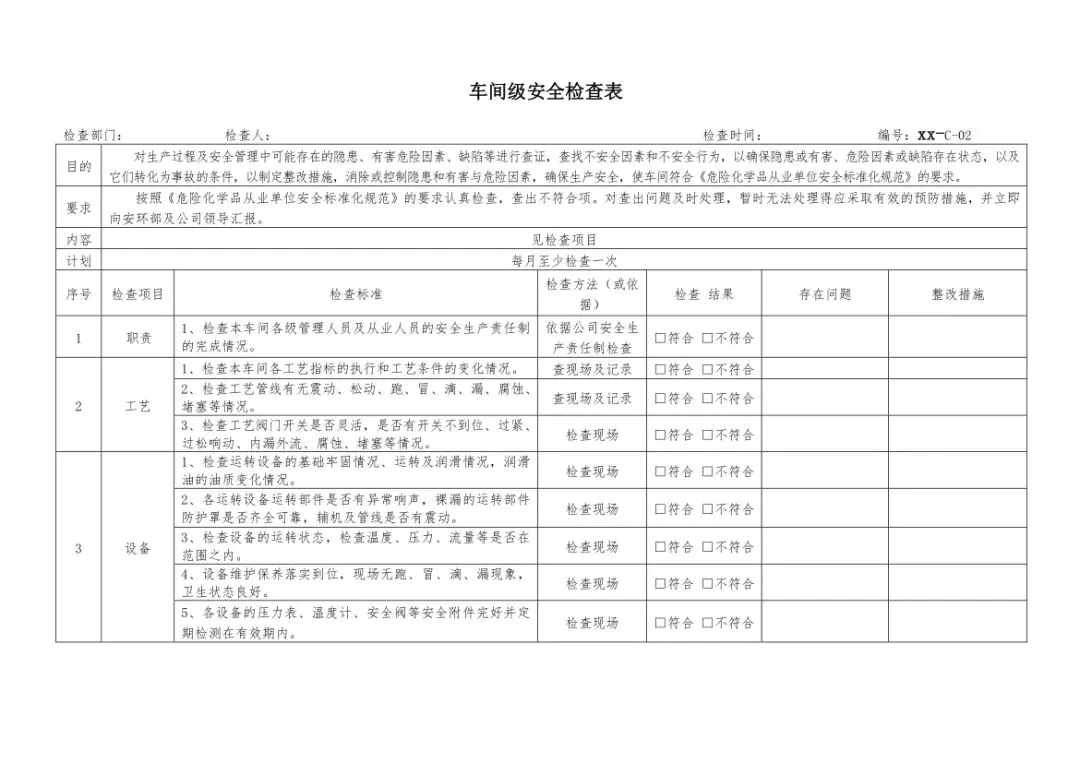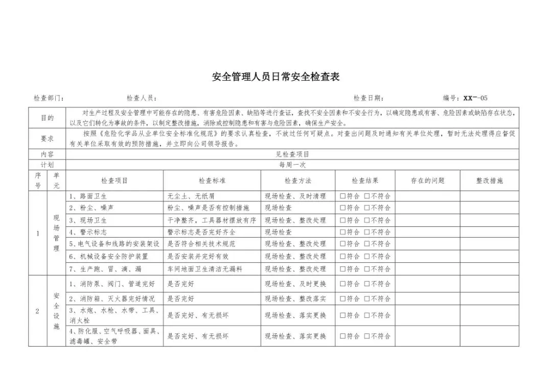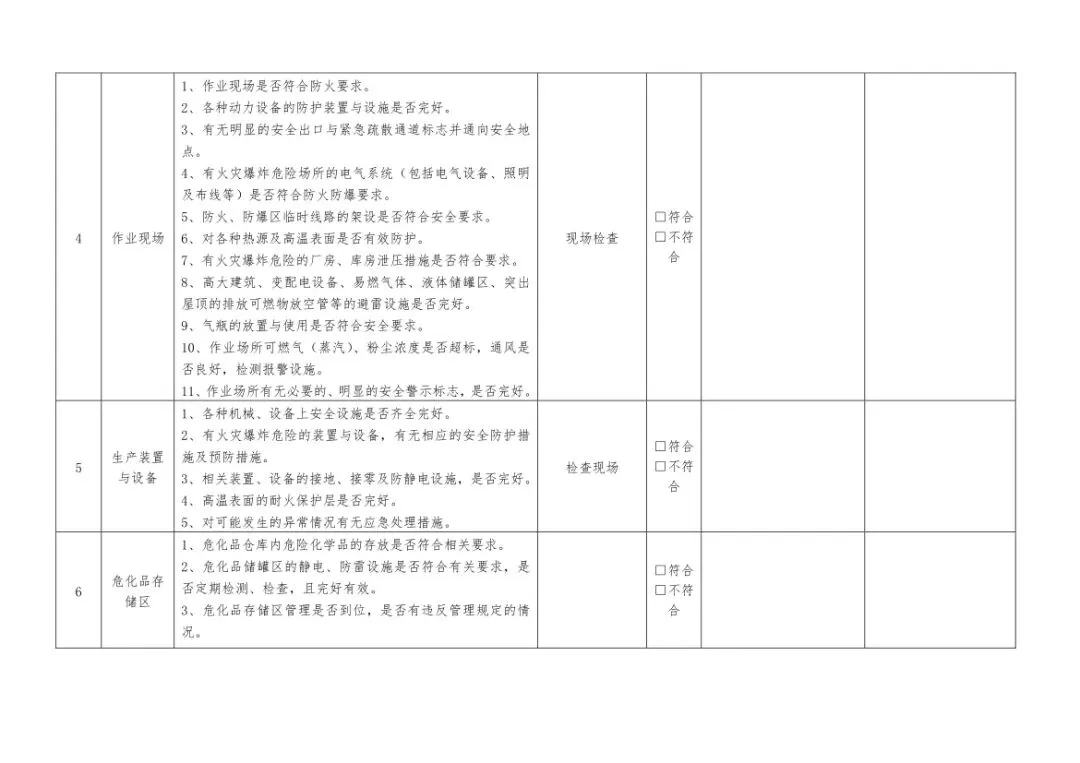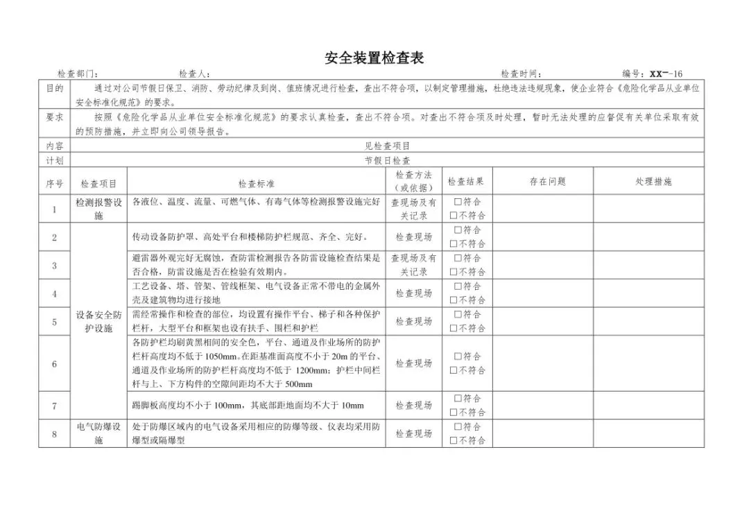 在设备与专项检查板块,更是做到了细分到项,电气设备、防火防爆及消防、防尘防毒、压力容器、危险化学品、机械设备、锅炉、监测仪表等关键领域,均有对应的专项检查表。每一份表格都明确了检查项目、检查标准、检查方法,设置了清晰的符合/不符合勾选栏,还有存在问题、整改措施填写区域,检查后能直接记录问题、落实整改,让安全检查从“走过场”变成“有依据、有记录、有整改”的闭环管理。