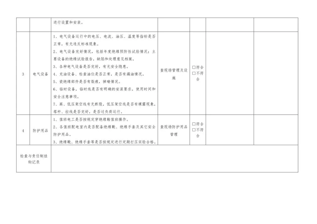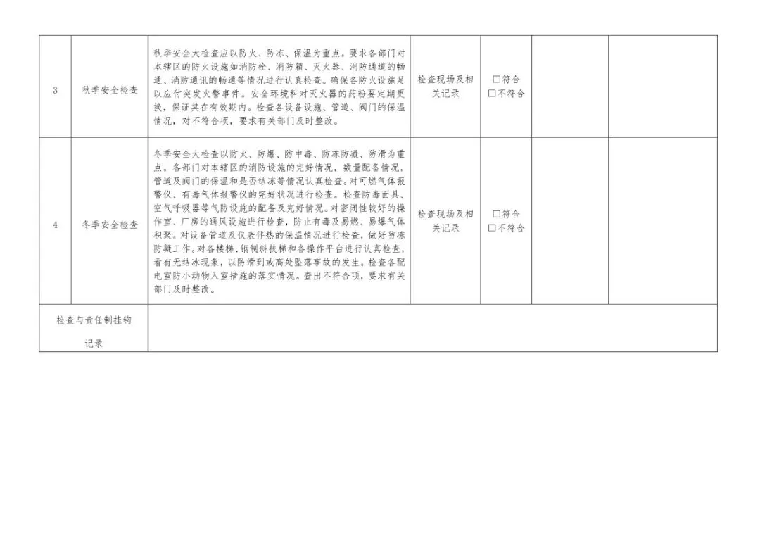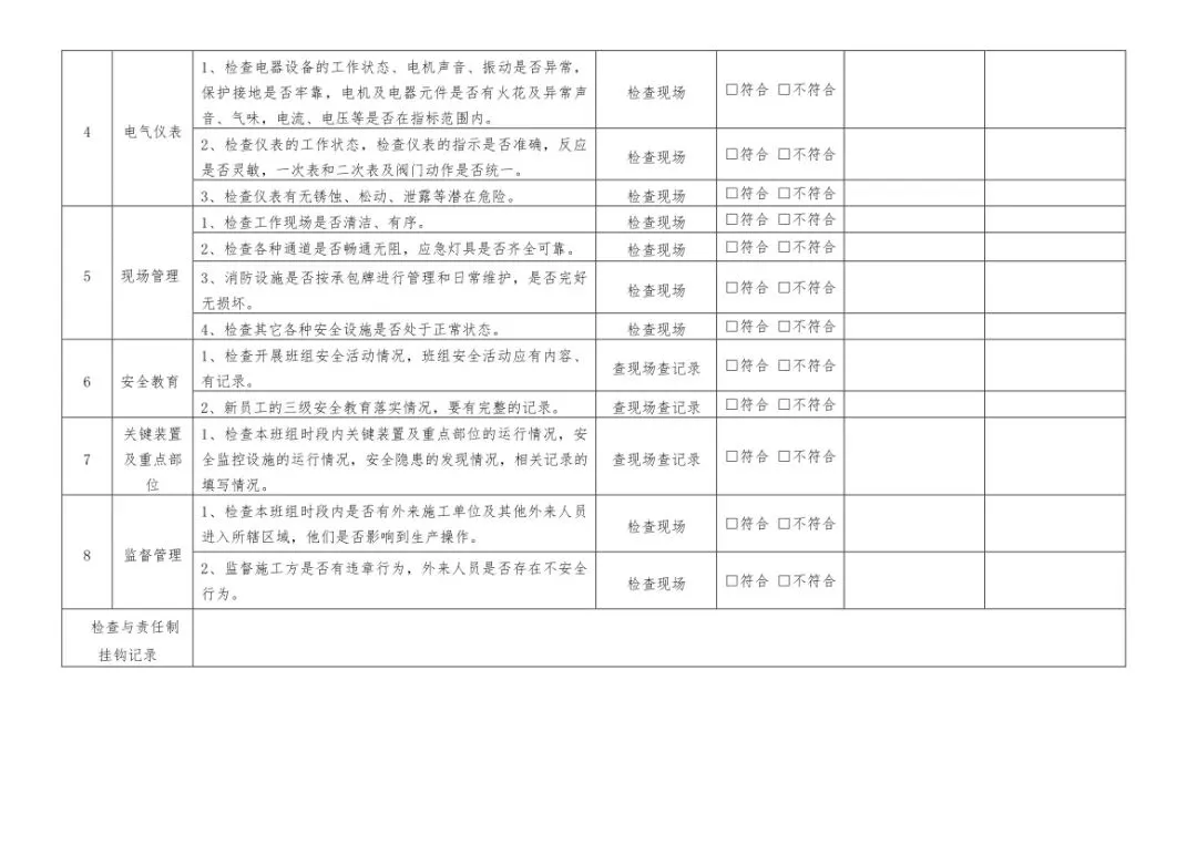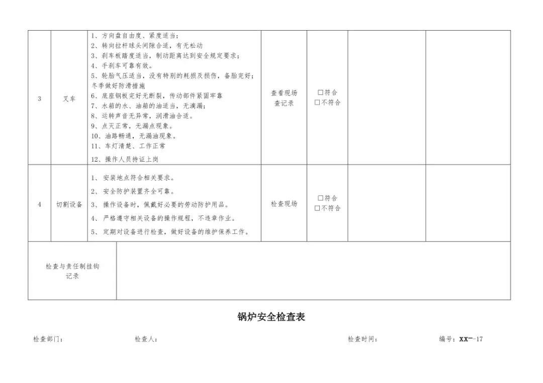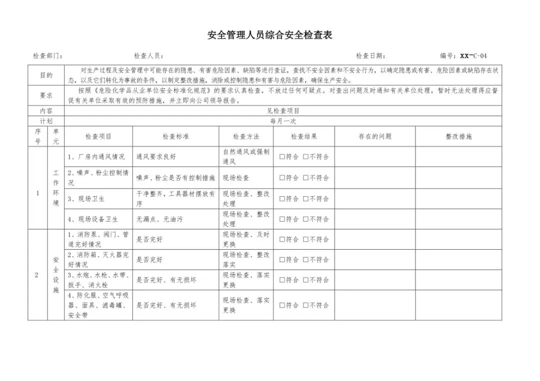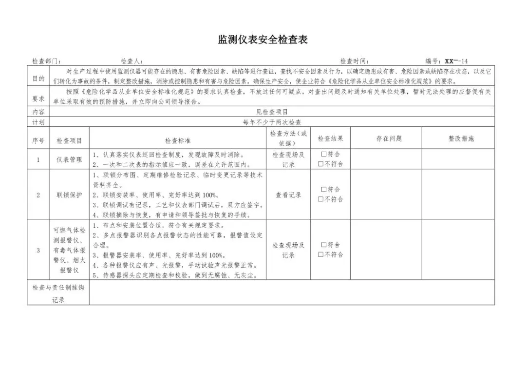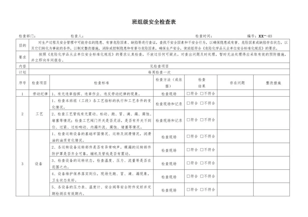 在设备与专项检查板块,更是做到了细分到项,电气设备、防火防爆及消防、防尘防毒、压力容器、危险化学品、机械设备、锅炉、监测仪表等关键领域,均有对应的专项检查表。每一份表格都明确了检查项目、检查标准、检查方法,设置了清晰的符合/不符合勾选栏,还有存在问题、整改措施填写区域,检查后能直接记录问题、落实整改,让安全检查从“走过场”变成“有依据、有记录、有整改”的闭环管理。