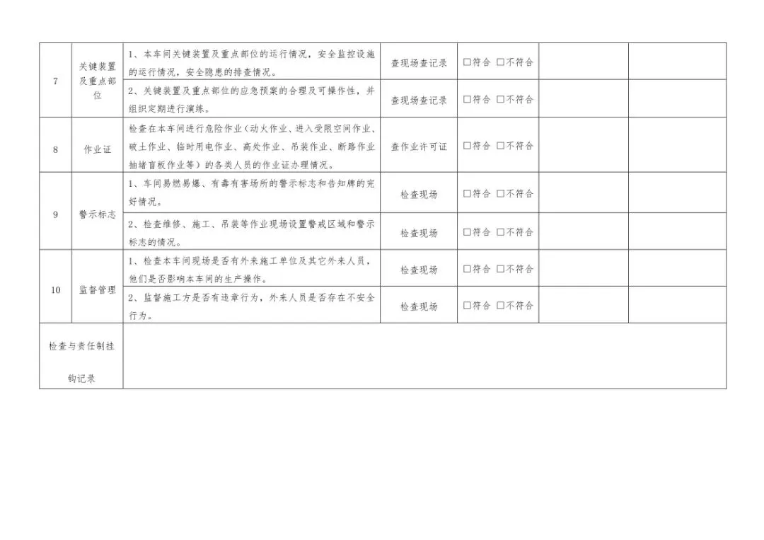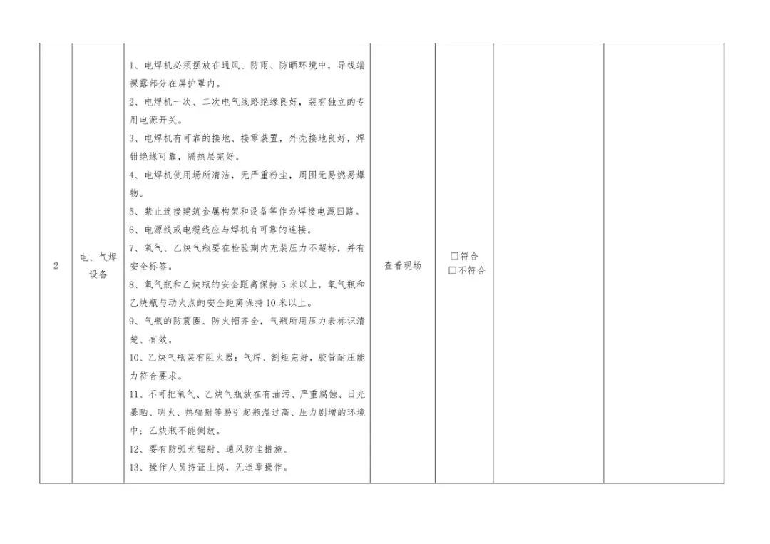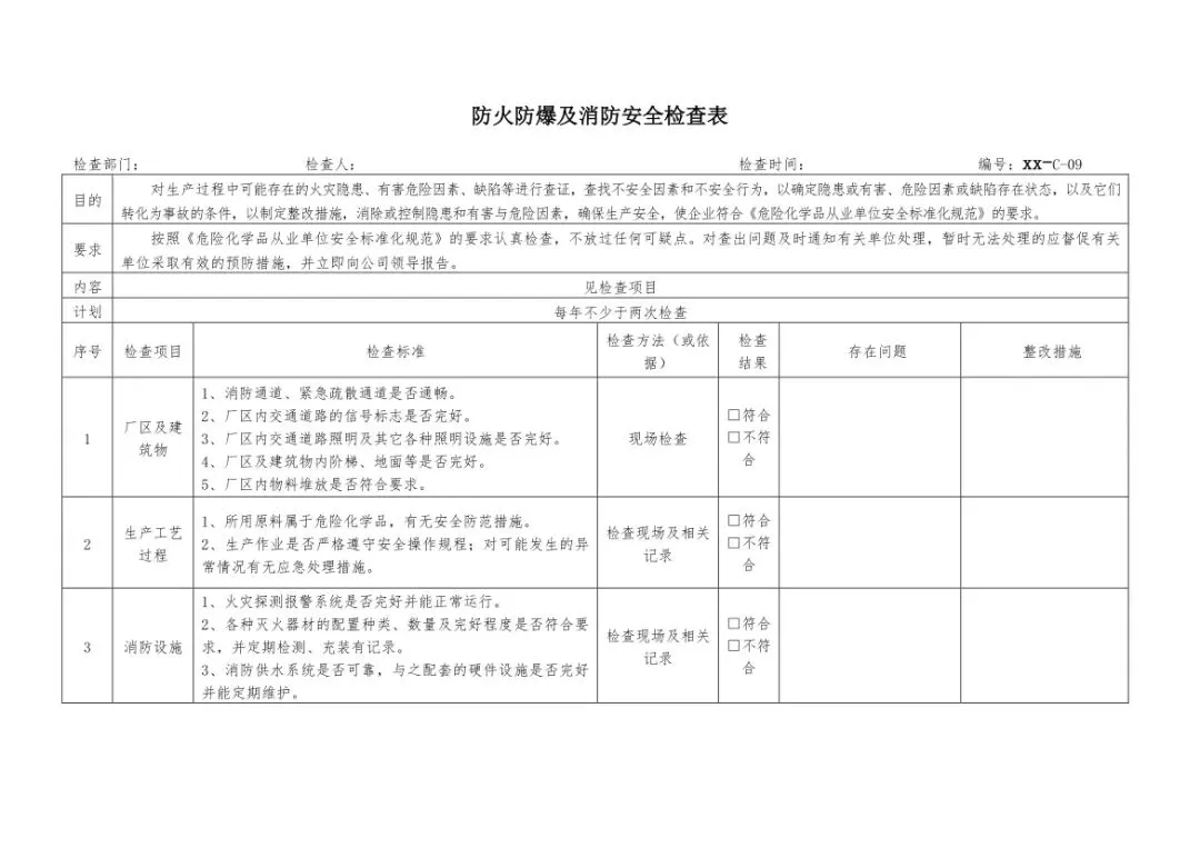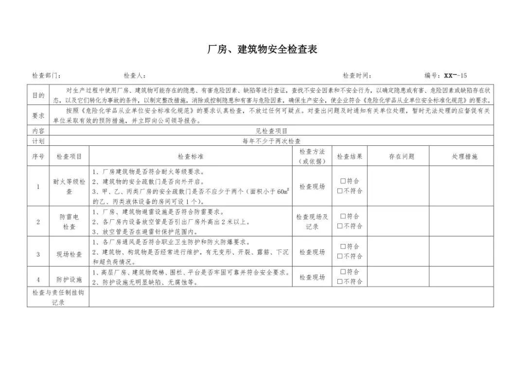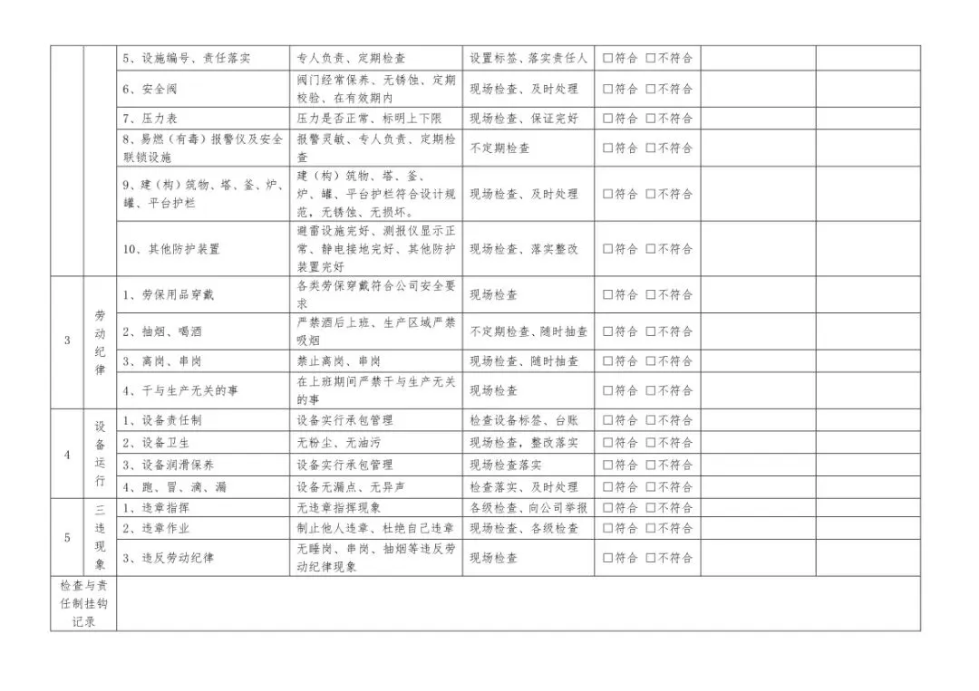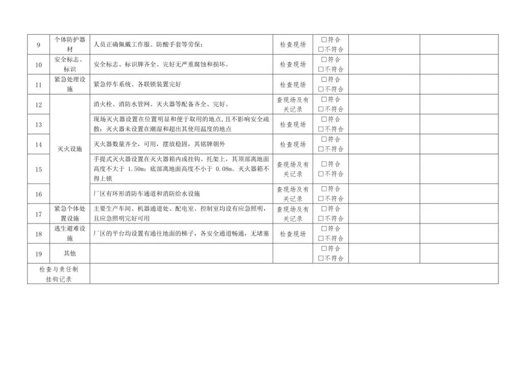 在设备与专项检查板块,更是做到了细分到项,电气设备、防火防爆及消防、防尘防毒、压力容器、危险化学品、机械设备、锅炉、监测仪表等关键领域,均有对应的专项检查表。每一份表格都明确了检查项目、检查标准、检查方法,设置了清晰的符合/不符合勾选栏,还有存在问题、整改措施填写区域,检查后能直接记录问题、落实整改,让安全检查从“走过场”变成“有依据、有记录、有整改”的闭环管理。