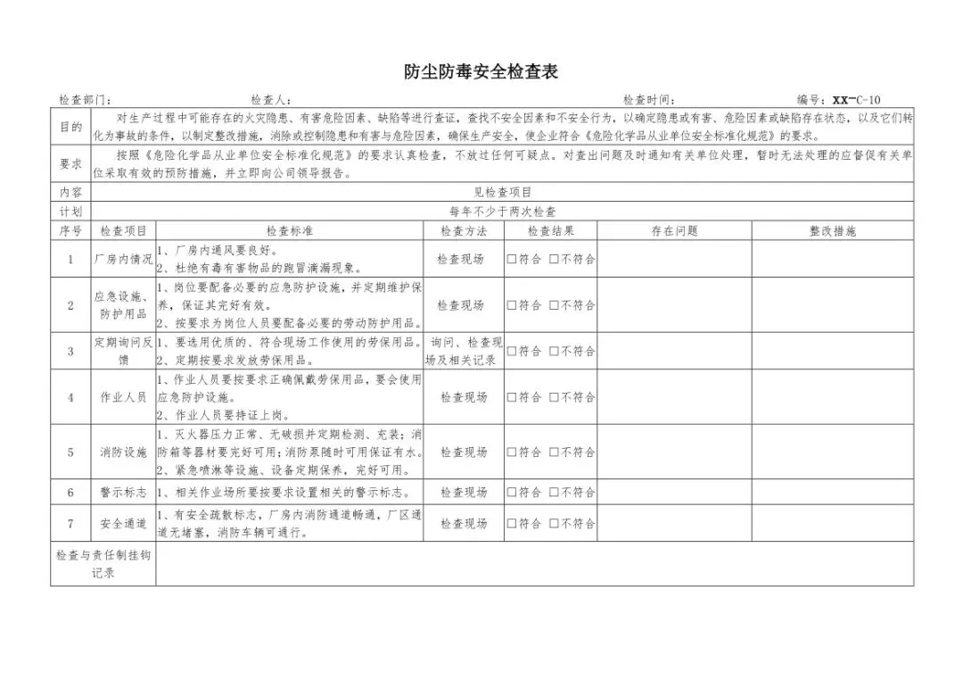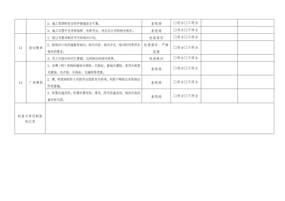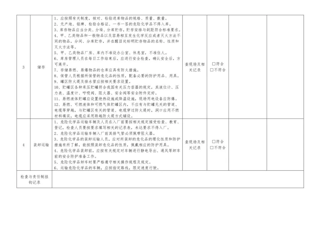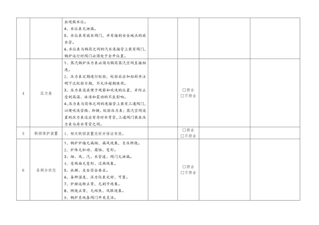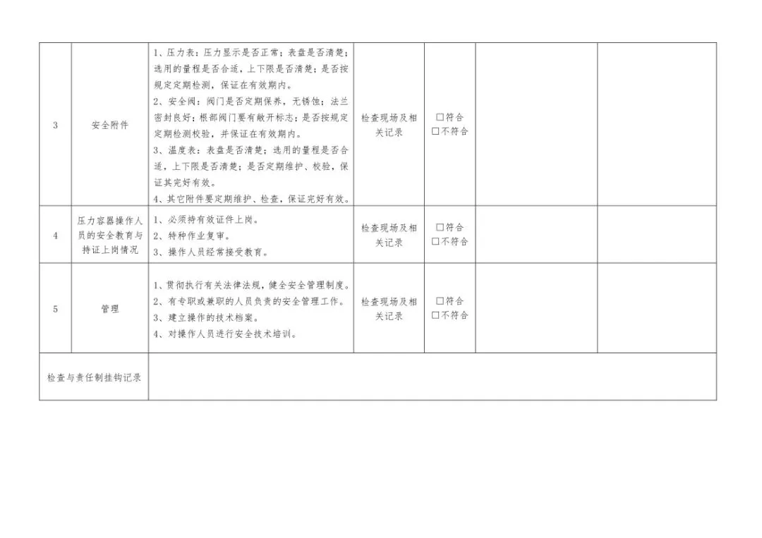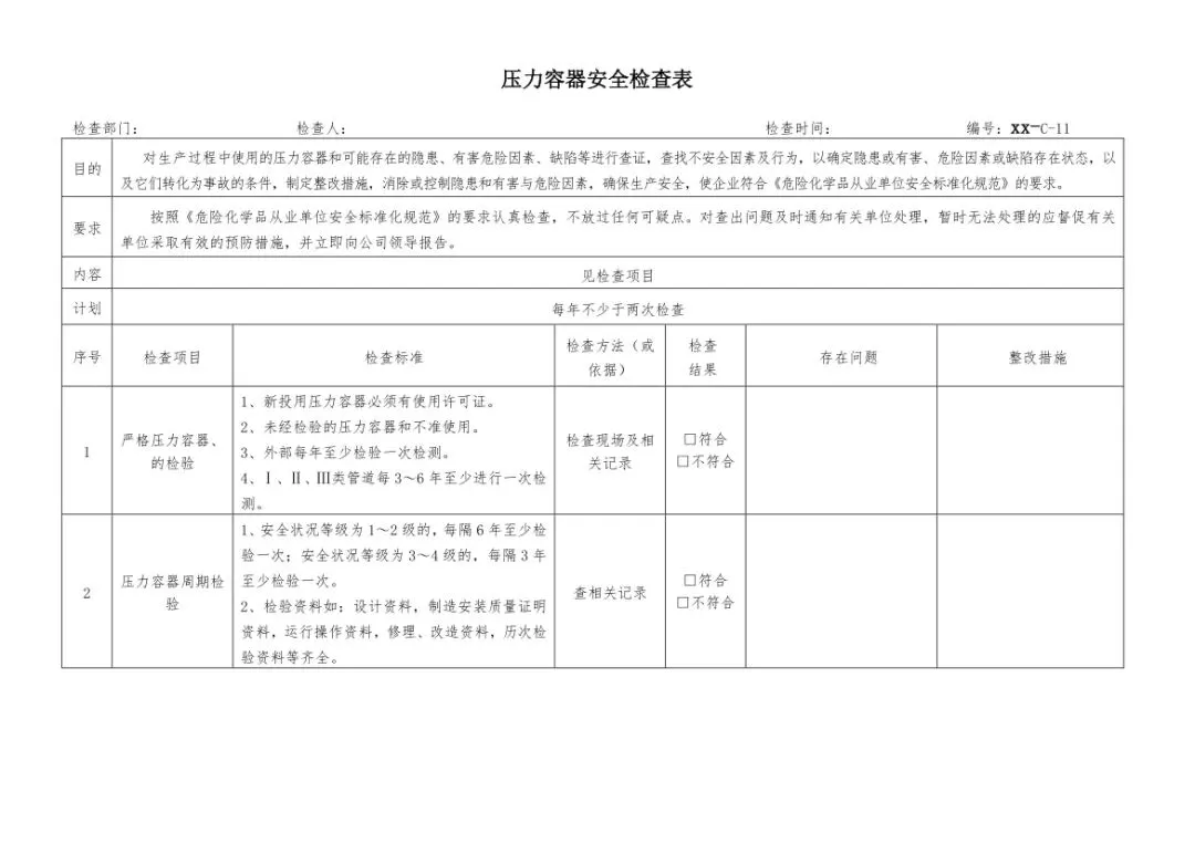 在设备与专项检查板块,更是做到了细分到项,电气设备、防火防爆及消防、防尘防毒、压力容器、危险化学品、机械设备、锅炉、监测仪表等关键领域,均有对应的专项检查表。每一份表格都明确了检查项目、检查标准、检查方法,设置了清晰的符合/不符合勾选栏,还有存在问题、整改措施填写区域,检查后能直接记录问题、落实整改,让安全检查从“走过场”变成“有依据、有记录、有整改”的闭环管理。