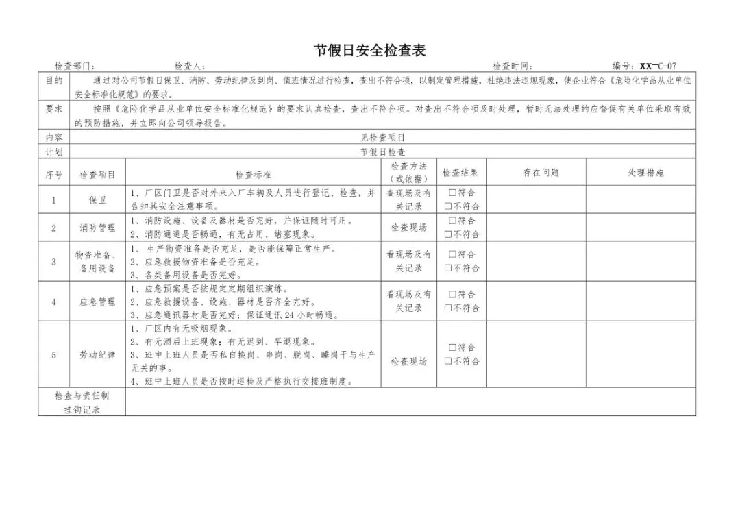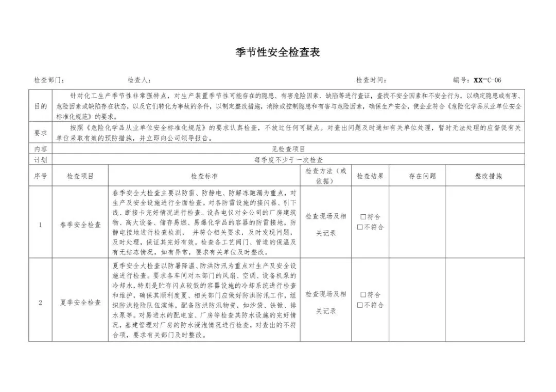这套安全检查表汇总,贴合企业安全生产的实际需求,从管理层面到实操层面,实现了安全检查的全覆盖、无死角。不仅包含公司级、车间级、班组级的分级综合检查表,还针对安全管理人员设计了日常、综合两类专属检查表,让不同岗位的工作人员都能找到适配的检查依据。同时,结合生产特点制定了季节性、节假日专项检查表,春季防雷防静电、夏季防暑防汛、冬季防火防冻凝,节假日值班、消防、物资保障等重点,都能精准覆盖。