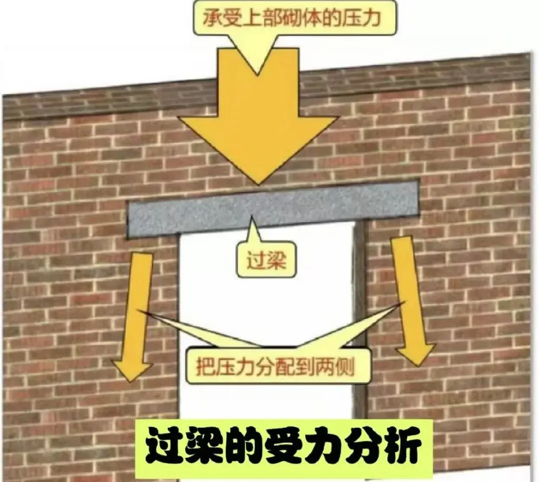 设于门窗洞口上方,承接墙体重量,防止压坏门窗、墙体开裂,需用混凝土浇筑(配钢筋),高度20~30公分,不可用砖块代替。