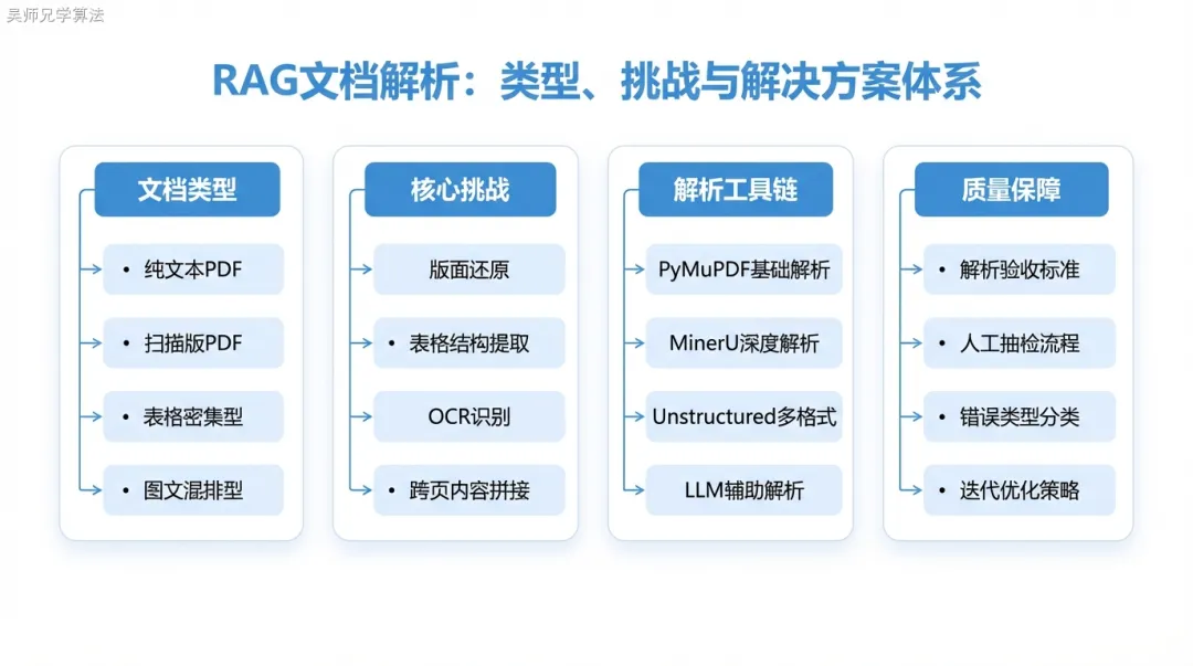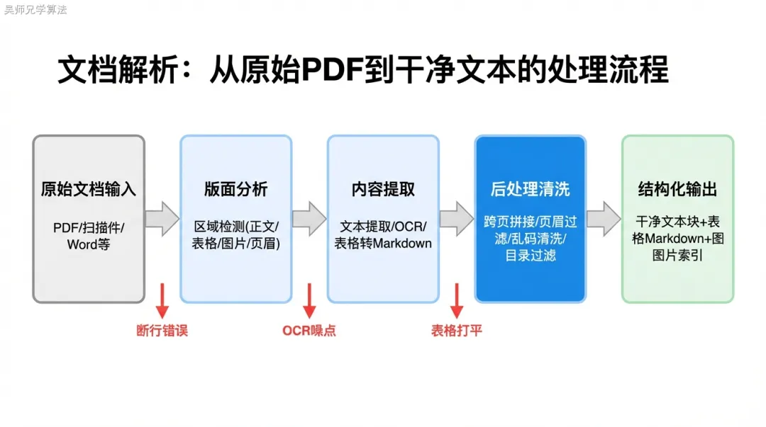 版面恢复、表格结构提取、OCR 噪声、跨页断裂——四个难点各一句话,点明文档解析不是”读文本”这么简单,而是一个结构还原问题。