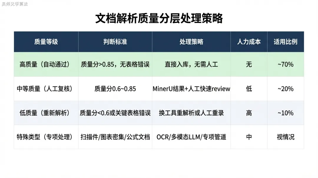 这种”自动解析 + 人工兜底”的分层策略在生产环境里是必要的——不能假设自动解析 100% 准确,也不能每份文档都人工处理,找到合适的质量阈值做分流是关键。
