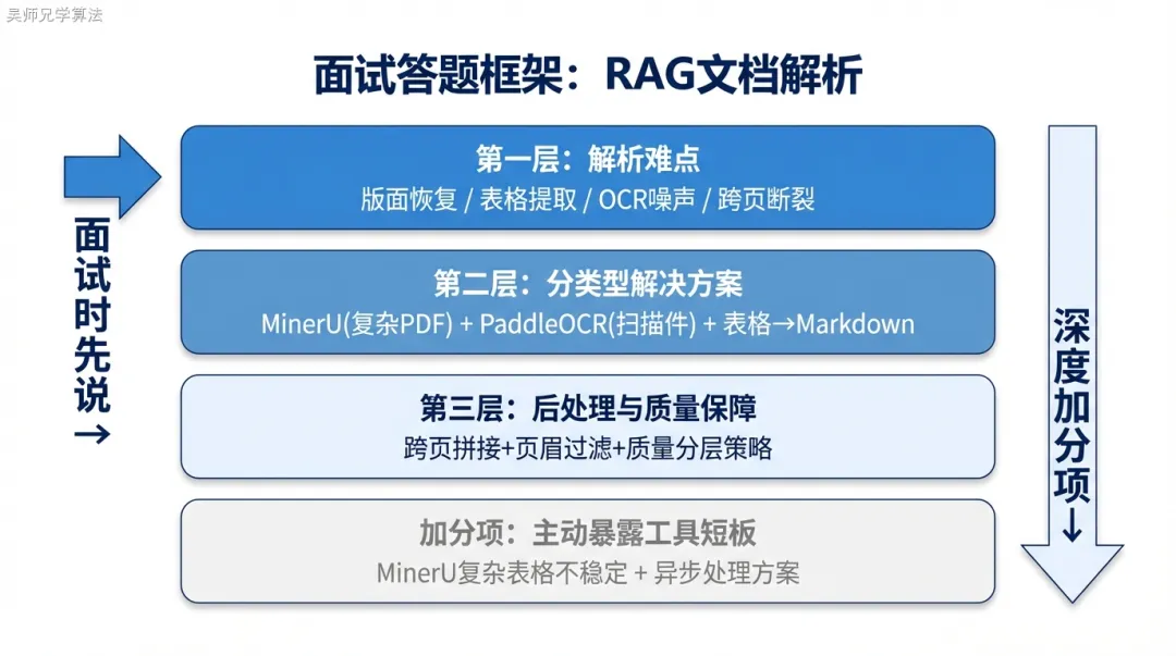 这道题的考察点不只是”你用了哪个解析工具”,而是你是否理解文档解析的核心难点在哪里、不同文档类型应该用什么策略、解析质量如何评估和改进。这些是真正在生产环境里踩过坑的人才能说清楚的内容。