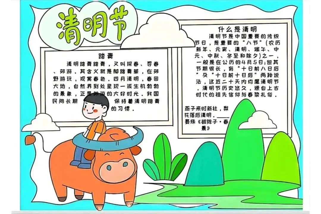 了解了这么多清明节知识,不妨动手制作一份清明节手抄报,把这些习俗和文化用色彩与图案展现出来,既加深对节日的理解,又能增添节日氛围。