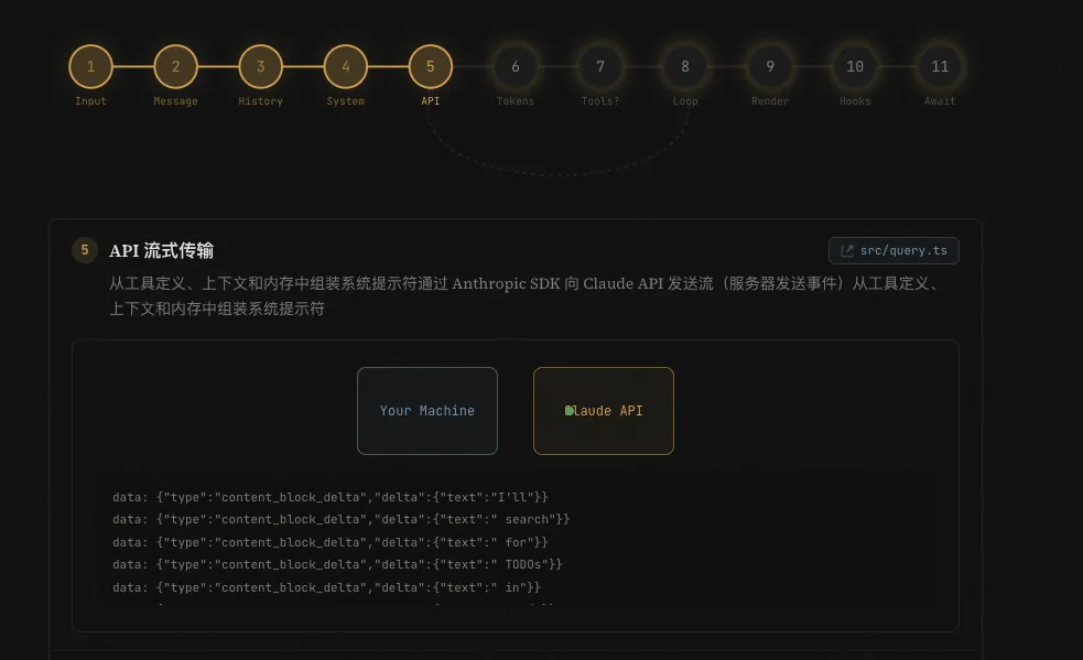 由开发者 @zackautocracy 创建的这个交互式网站,把 Claude Code 从输入到输出的完整流程做成了可点击、可动画演示的可视化作品: